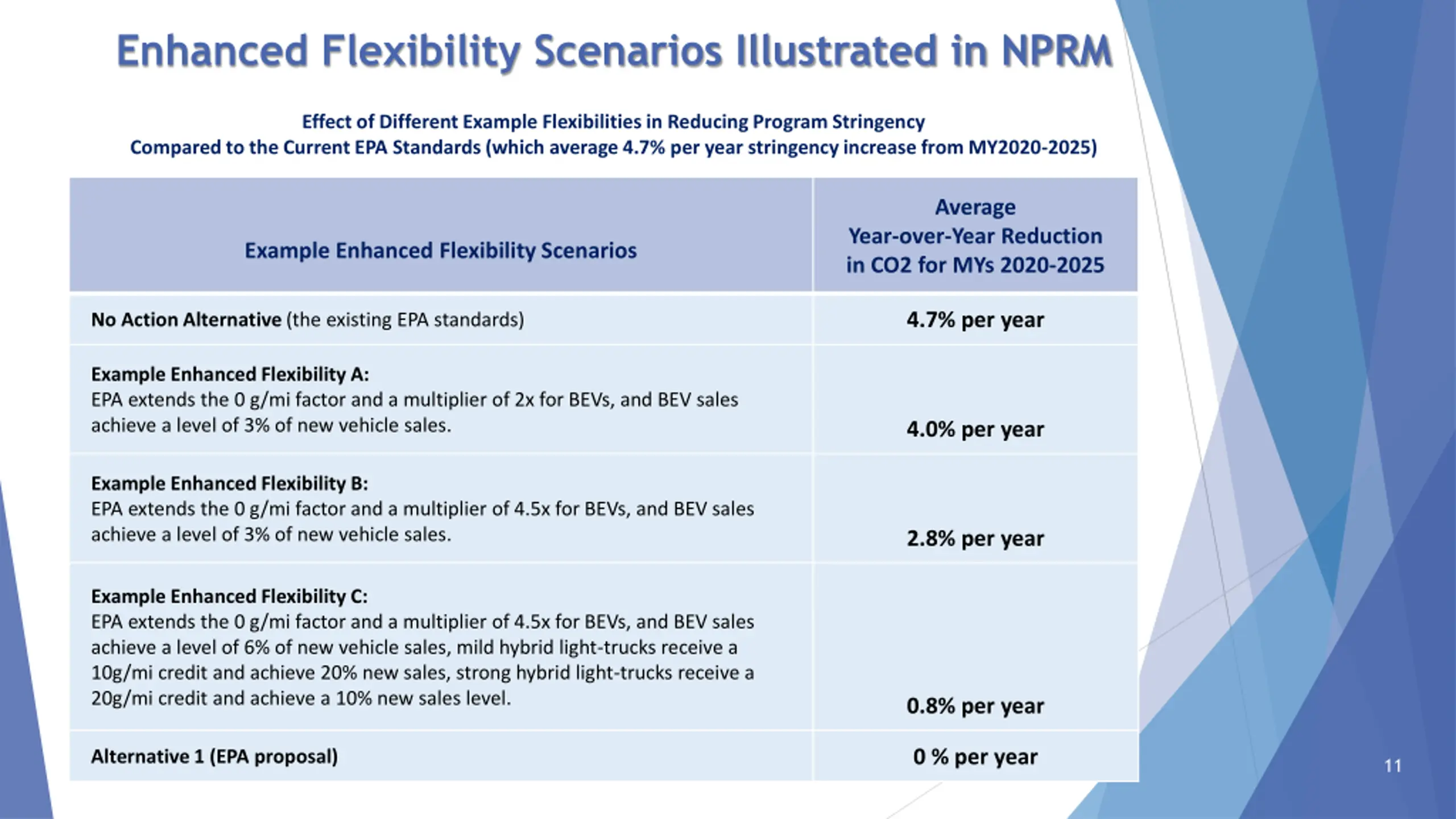 Request for Comment on Enhanced Flexibilities Alternative EPA is seeking comment on a variety of enhanced flexibilities to broaden the pathways available to manufacturers in meeting a given level of stringency of the standards Advanced technology incentives Hybrid incentives Off-cycle emissions credits Connected/autonomous vehicle incentives Emission credit life extension Natural gas vehicle incentives High octane gasoline fuel blends 10