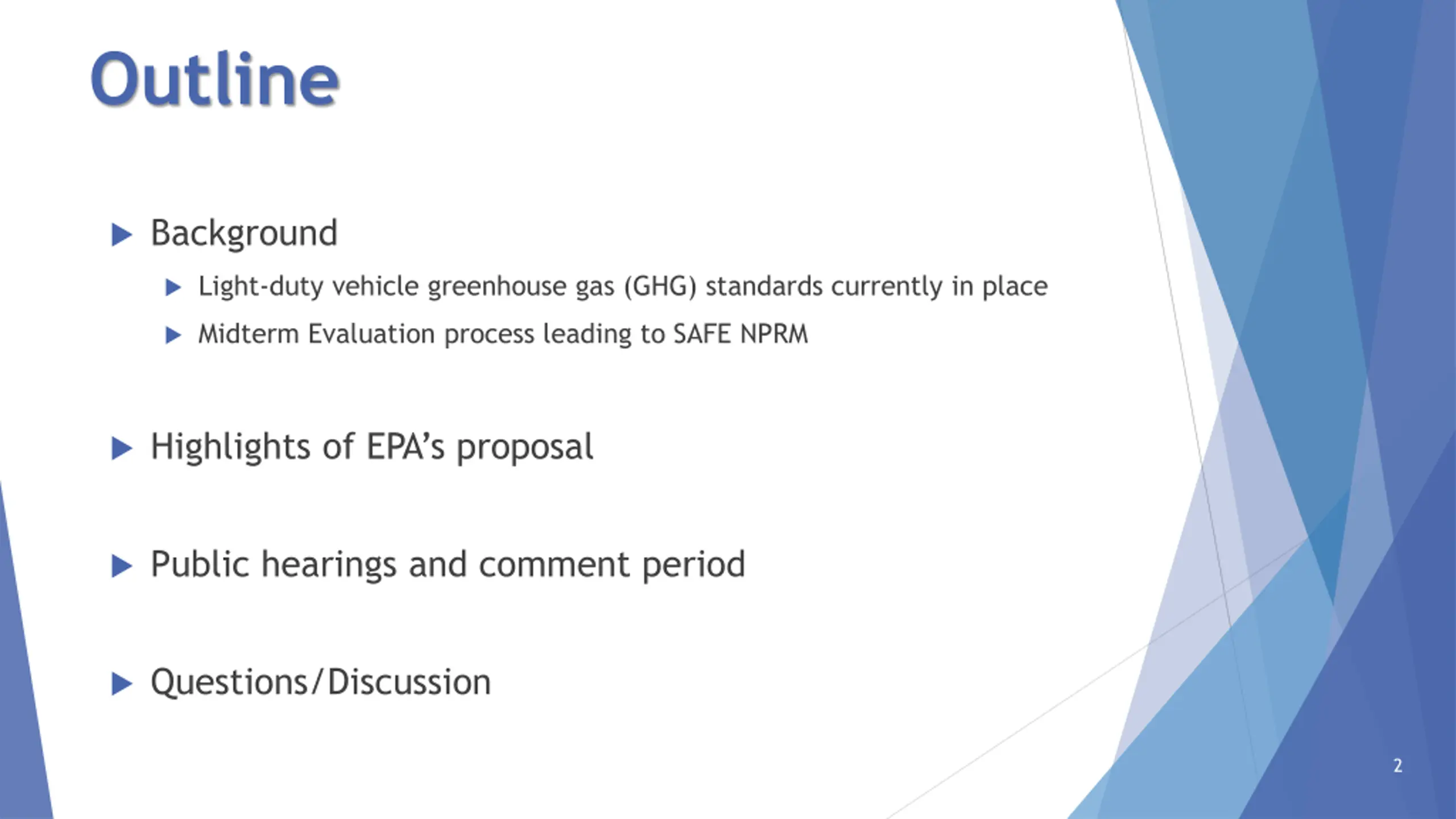 Outline Background Light-duty vehicle greenhouse gas (GHG) standards currently in place Midterm Evaluation process leading to SAFE NPRM Highlights of EPA s proposal Public hearings and comment period Questions/Discussion 2