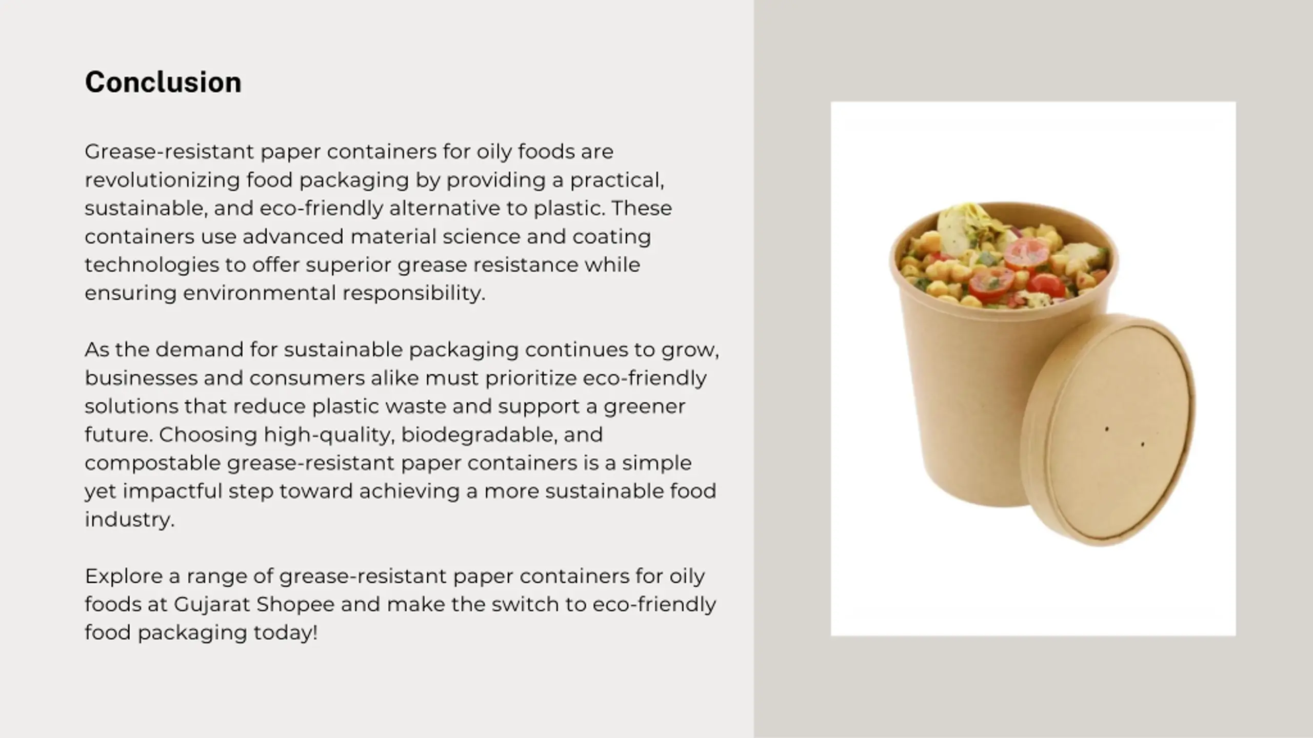 Conclusion Grease-resistant paper containers for oily foods are revolutionizing food packaging by providing a practical, sustainable, and eco-friendly alternative to plastic. These containers use advanced material science and coating technologies to offer superior grease resistance while ensuring environmental responsibility. As the demand for sustainable packaging continues to grow, businesses and consumers alike must prioritize eco-friendly solutions that reduce plastic waste and support a greener future. Choosing high-quality, biodegradable, and compostable grease-resistant paper containers is a simple yet impactful step toward achieving a more sustainable food industry. Explore a range of grease-resistant paper containers for oily foods at Gujarat Shopee and make the switch to eco-friendly food packaging today!