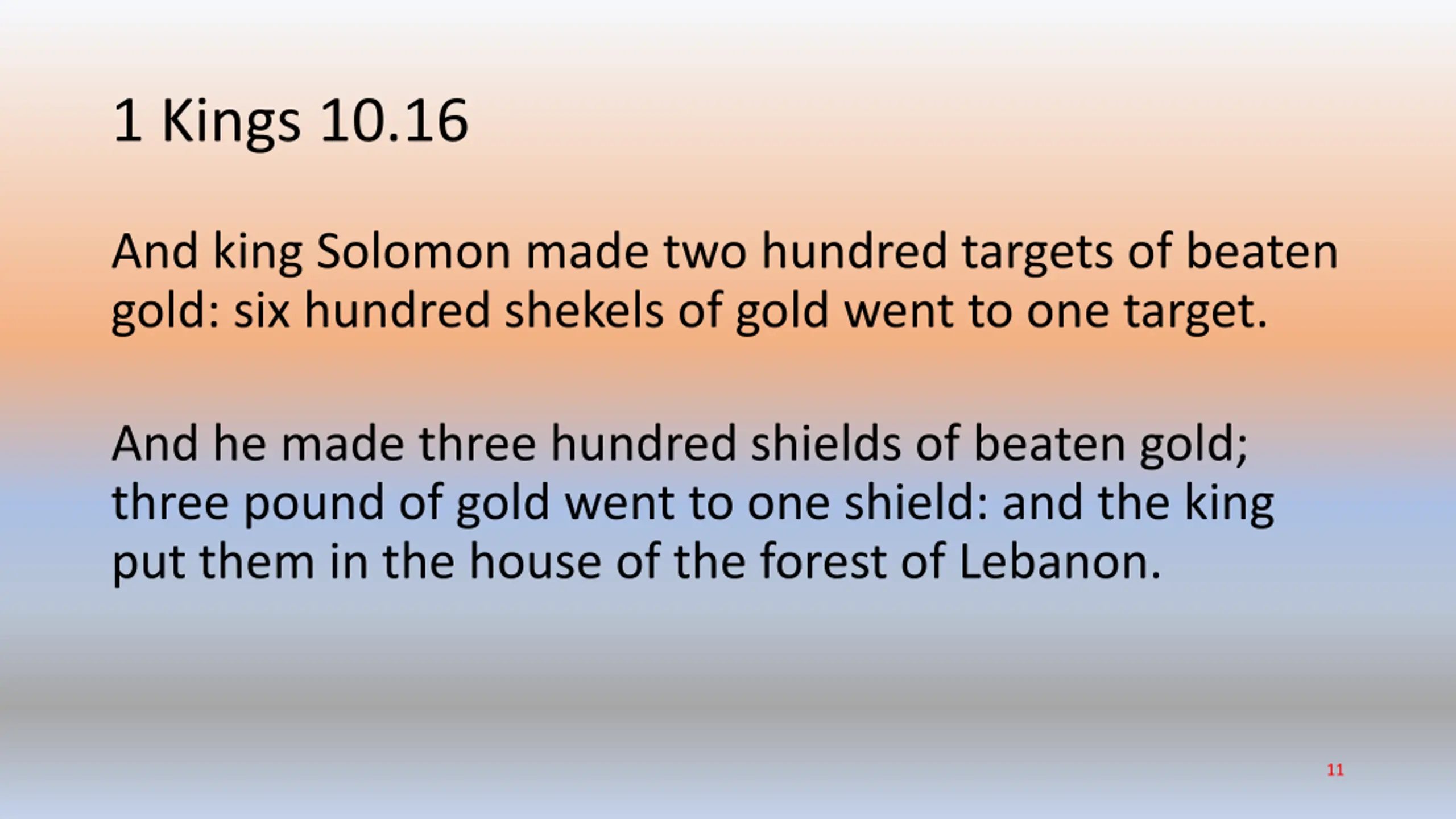 1 Kings 10.16 And king Solomon made two hundred targets of beaten gold: six hundred shekels of gold went to one target. And he made three hundred shields of beaten gold; three pound of gold went to one shield: and the king put them in the house of the forest of Lebanon. 11