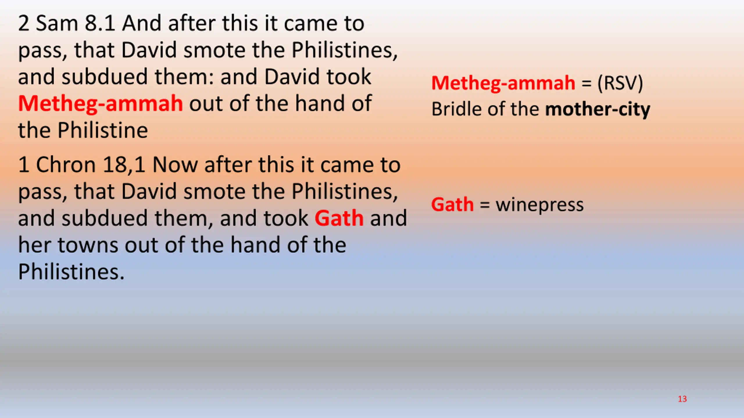 2 Sam 8.1 And after this it came to pass, that David smote the Philistines, and subdued them: and David took Metheg-ammah out of the hand of the Philistine 1 Chron 18,1 Now after this it came to pass, that David smote the Philistines, and subdued them, and took Gath and her towns out of the hand of the Philistines. Metheg-ammah = (RSV) Bridle of the mother-city Gath = winepress 13