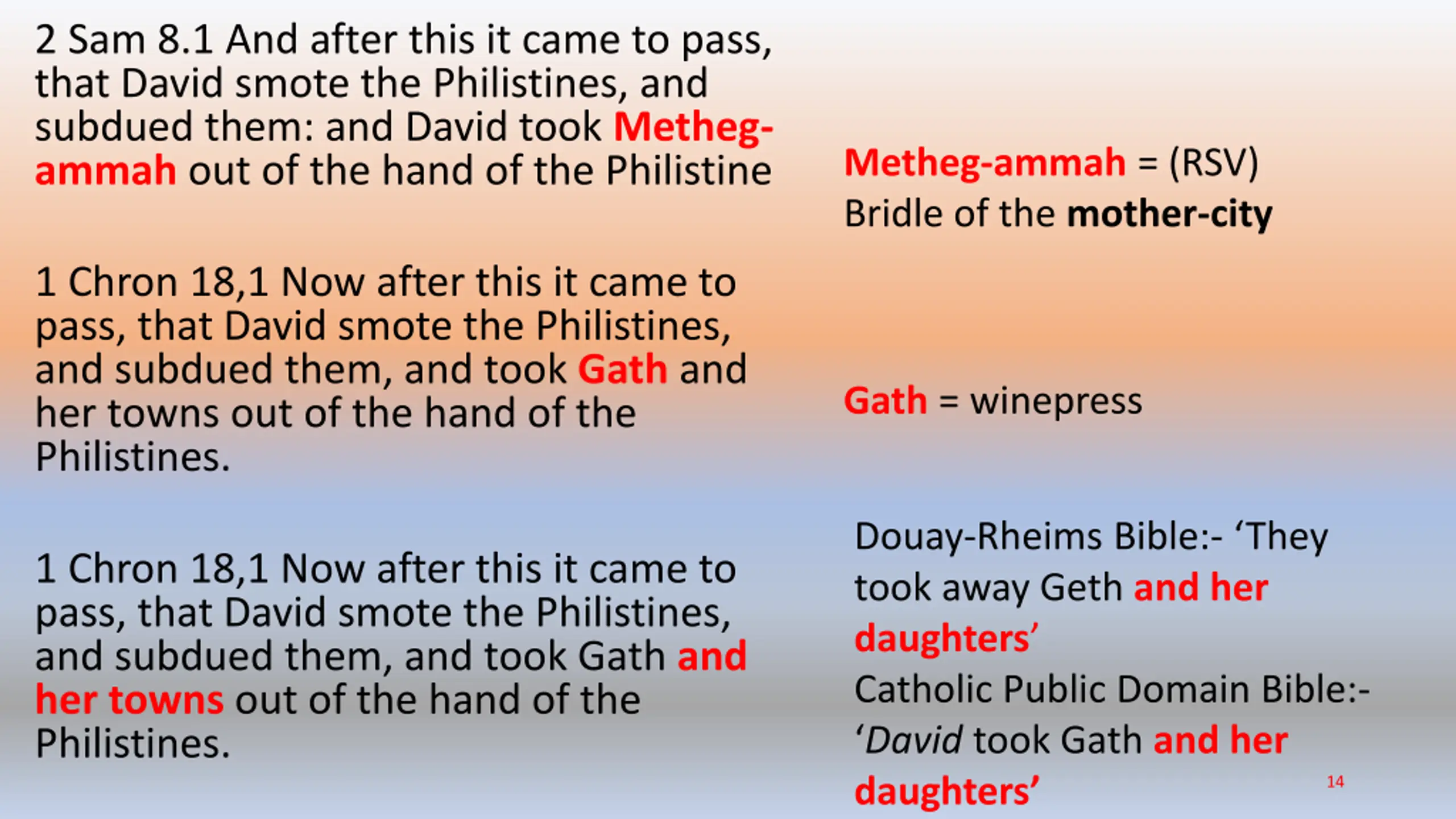 2 Sam 8.1 And after this it came to pass, that David smote the Philistines, and subdued them: and David took Metheg- ammah out of the hand of the Philistine Metheg-ammah = (RSV) Bridle of the mother-city 1 Chron 18,1 Now after this it came to pass, that David smote the Philistines, and subdued them, and took Gath and her towns out of the hand of the Philistines. Gath = winepress Douay-Rheims Bible:- They took away Geth and her daughters Catholic Public Domain Bible:- David took Gath and her daughters 1 Chron 18,1 Now after this it came to pass, that David smote the Philistines, and subdued them, and took Gath and her towns out of the hand of the Philistines. 14