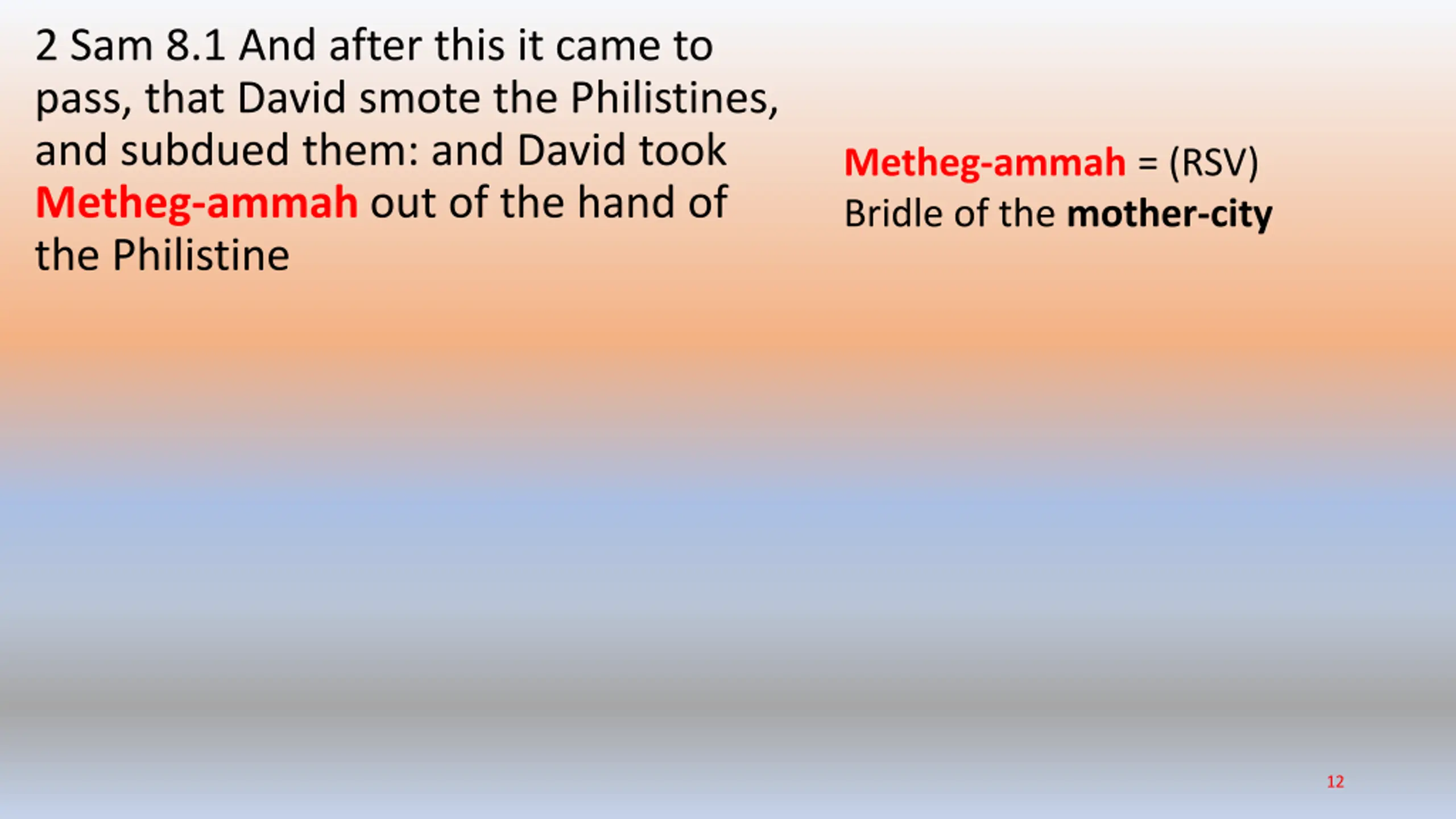 2 Sam 8.1 And after this it came to pass, that David smote the Philistines, and subdued them: and David took Metheg-ammah out of the hand of the Philistine Metheg-ammah = (RSV) Bridle of the mother-city 12