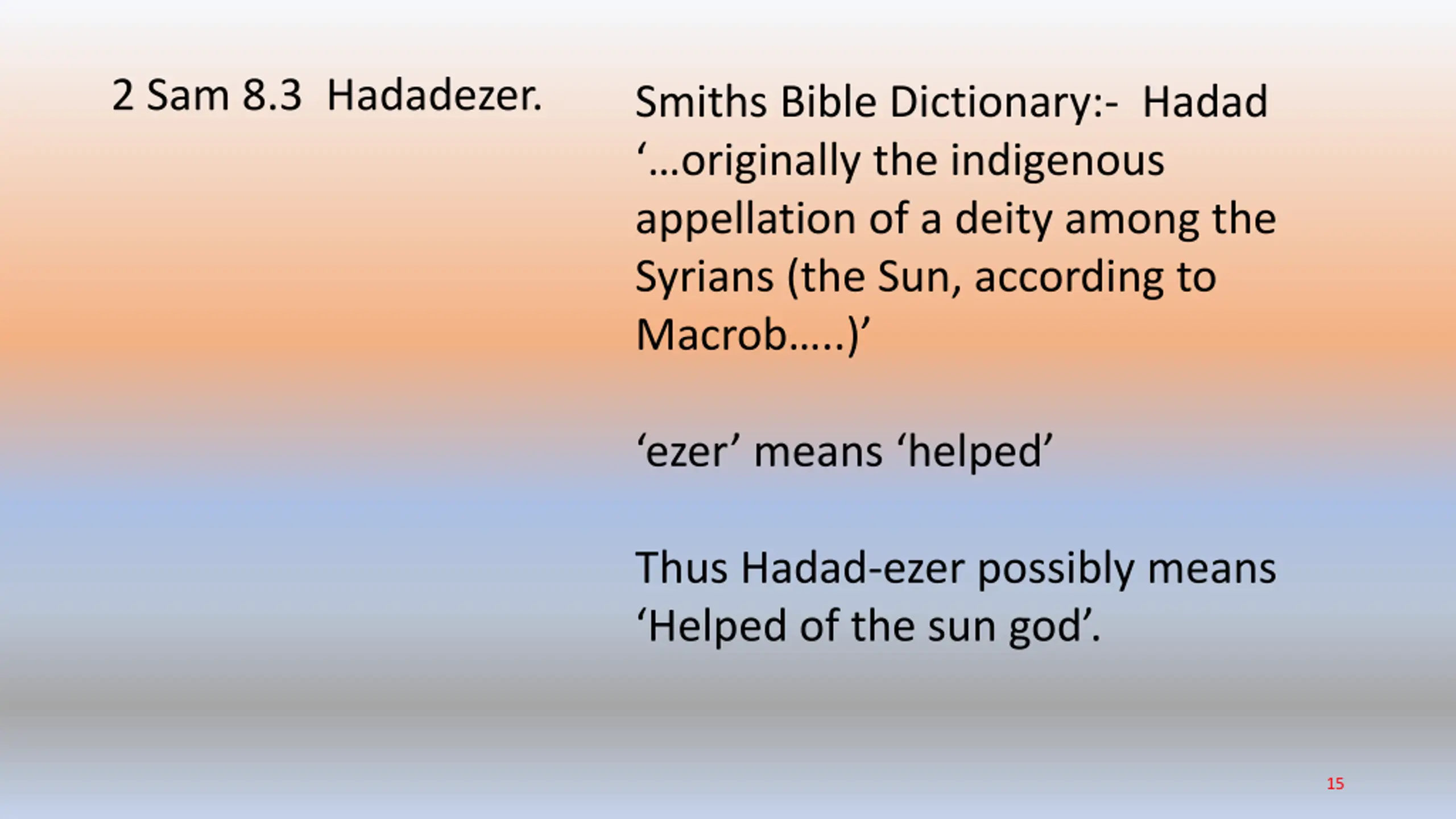 2 Sam 8.3 Hadadezer. Smiths Bible Dictionary:- Hadad originally the indigenous appellation of a deity among the Syrians (the Sun, according to Macrob ..) ezer means helped Thus Hadad-ezer possibly means Helped of the sun god . 15