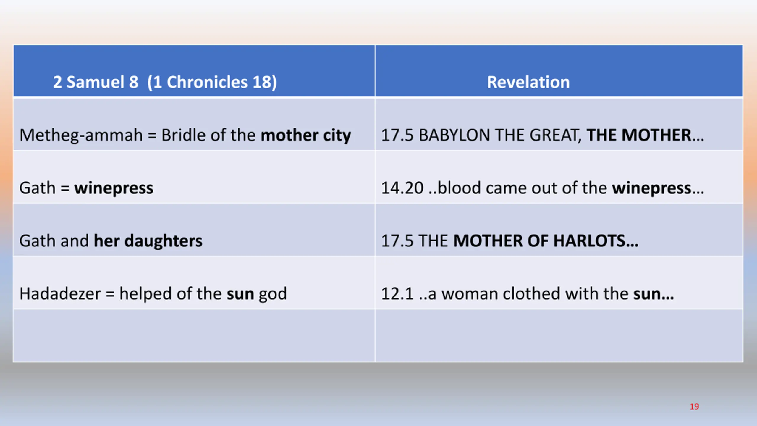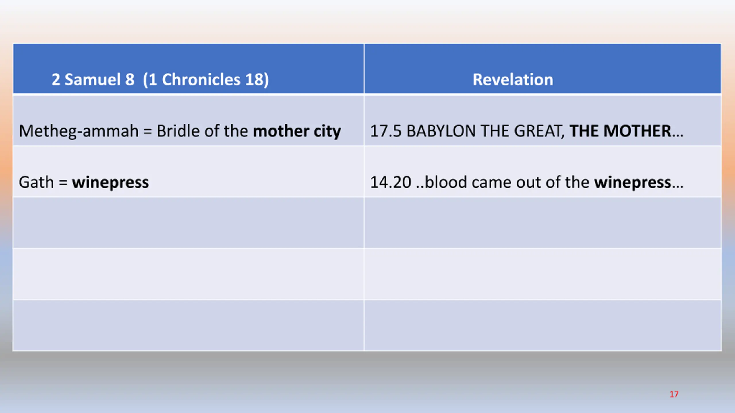 2 Samuel 8 (1 Chronicles 18) Revelation Metheg-ammah = Bridle of the mother city 17.5 BABYLON THE GREAT, THE MOTHER Gath = winepress 14.20 ..blood came out of the winepress 17