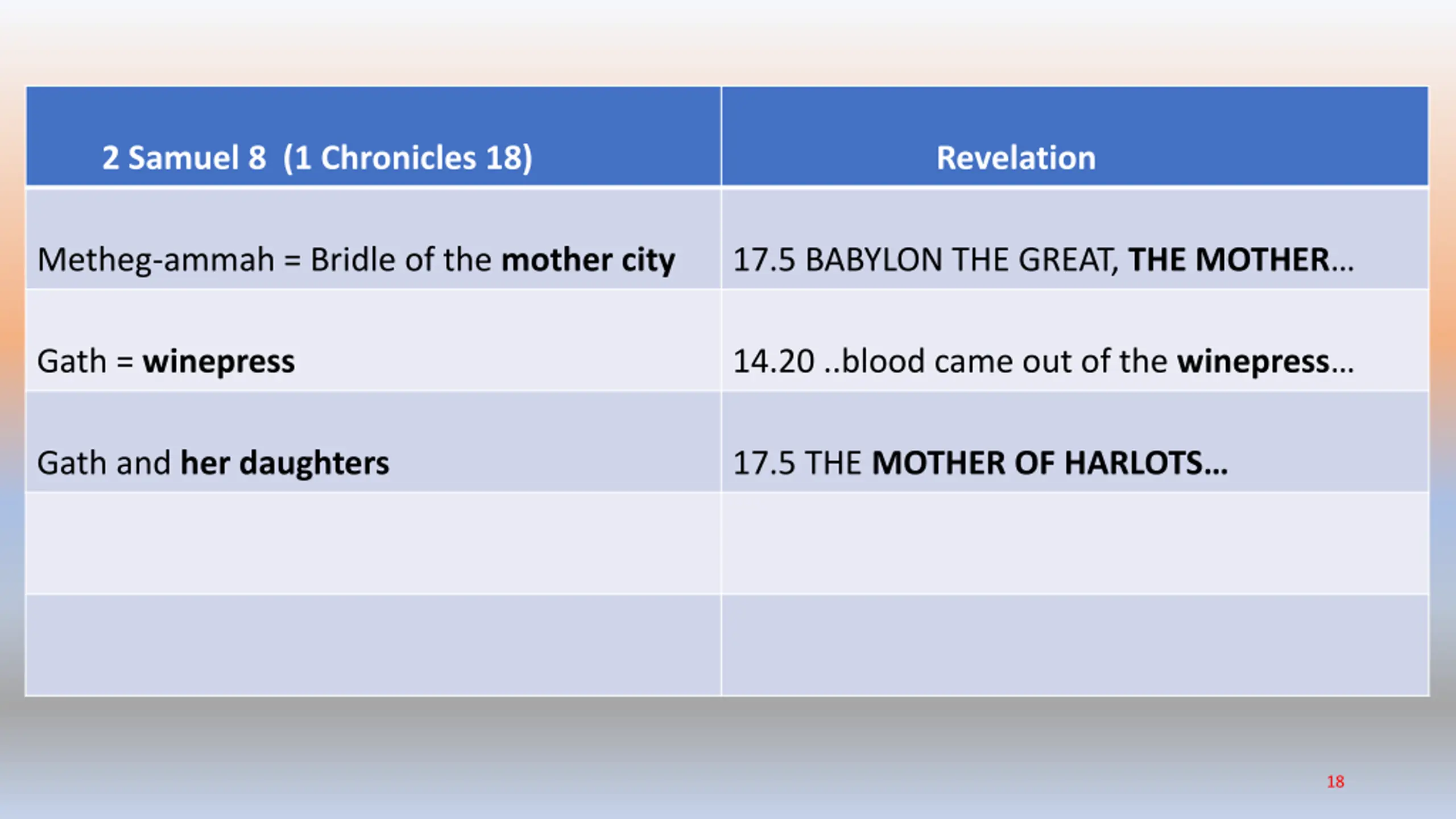 2 Samuel 8 (1 Chronicles 18) Revelation Metheg-ammah = Bridle of the mother city 17.5 BABYLON THE GREAT, THE MOTHER Gath = winepress 14.20 ..blood came out of the winepress Gath and her daughters 17.5 THE MOTHER OF HARLOTS 18