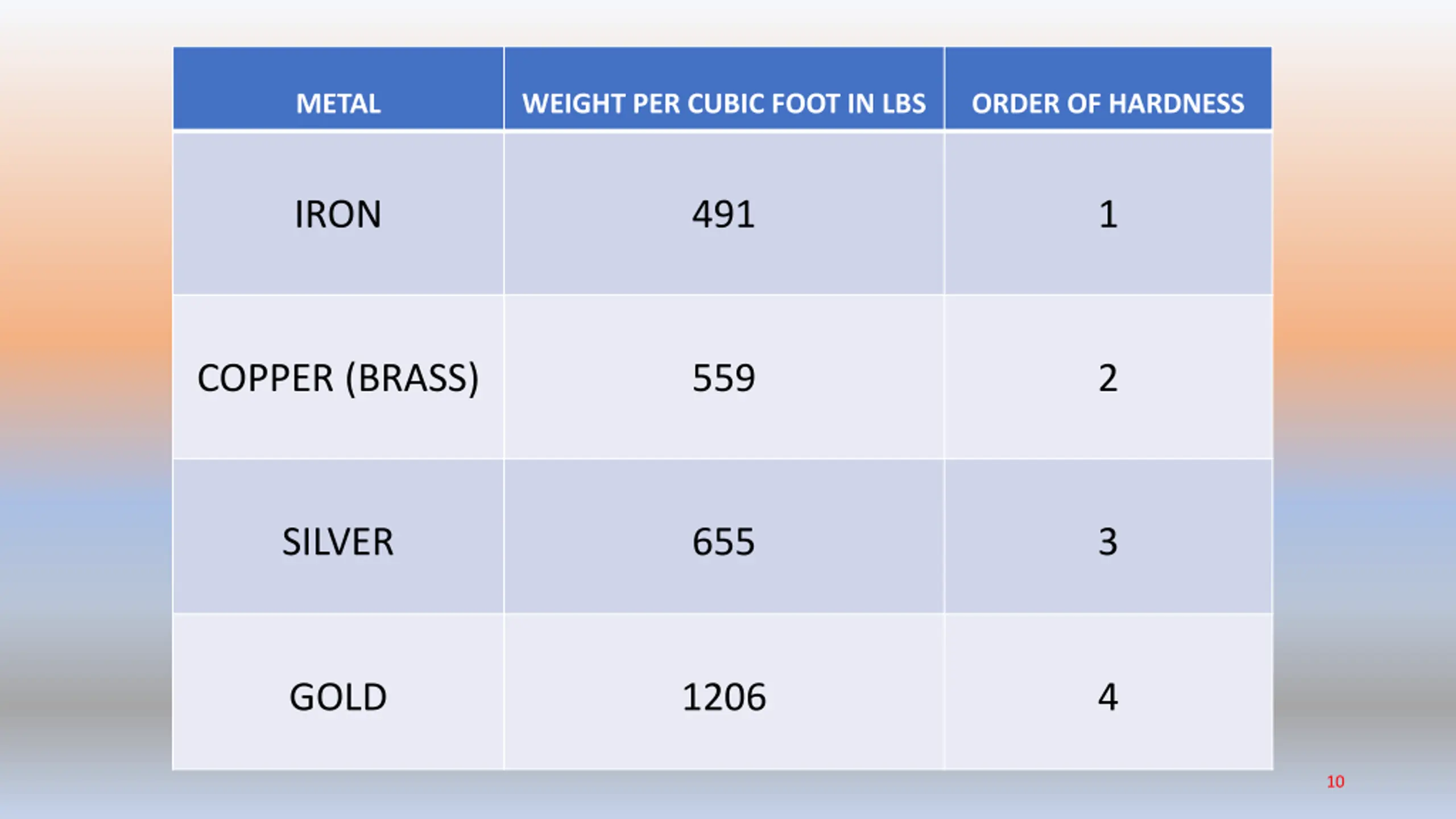 METAL WEIGHT PER CUBIC FOOT IN LBS ORDER OF HARDNESS IRON 491 1 COPPER (BRASS) 559 2 SILVER 655 3 GOLD 1206 4 10
