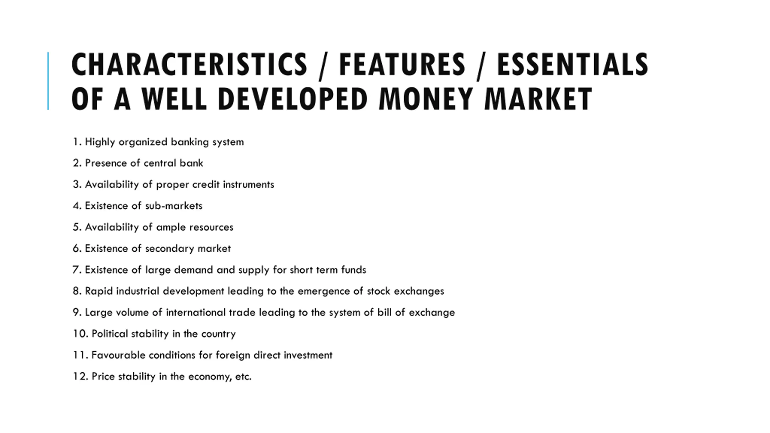CHARACTERISTICS / FEATURES / ESSENTIALS OF A WELL DEVELOPED MONEY MARKET 1. Highly organized banking system 2. Presence of central bank 3. Availability of proper credit instruments 4. Existence of sub-markets 5. Availability of ample resources 6. Existence of secondary market 7. Existence of large demand and supply for short term funds 8. Rapid industrial development leading to the emergence of stock exchanges 9. Large volume of international trade leading to the system of bill of exchange 10. Political stability in the country 11. Favourable conditions for foreign direct investment 12. Price stability in the economy, etc.