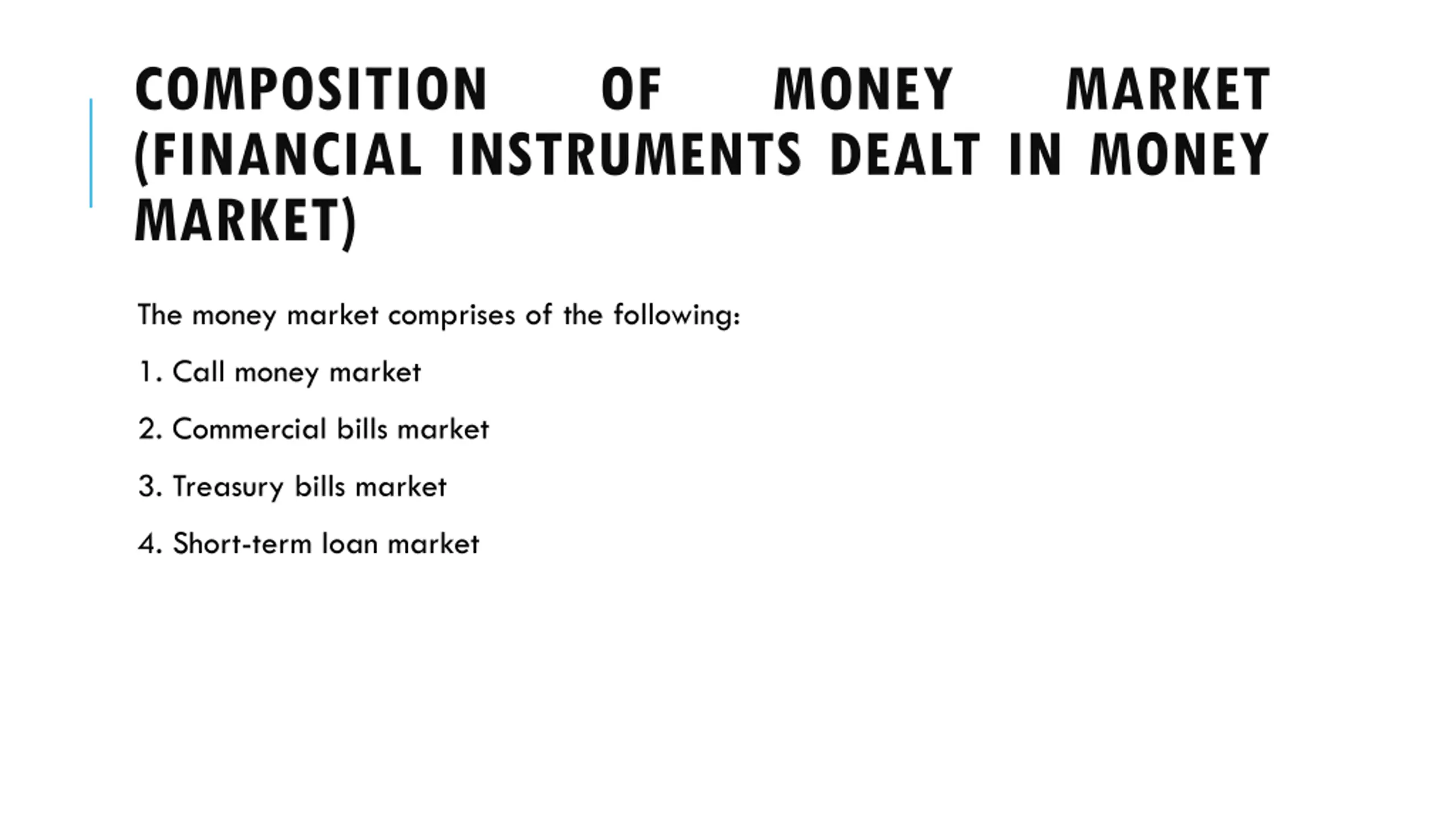 COMPOSITION (FINANCIAL INSTRUMENTS DEALT IN MONEY MARKET) OF MONEY MARKET The money market comprises of the following: 1. Call money market 2. Commercial bills market 3. Treasury bills market 4. Short-term loan market