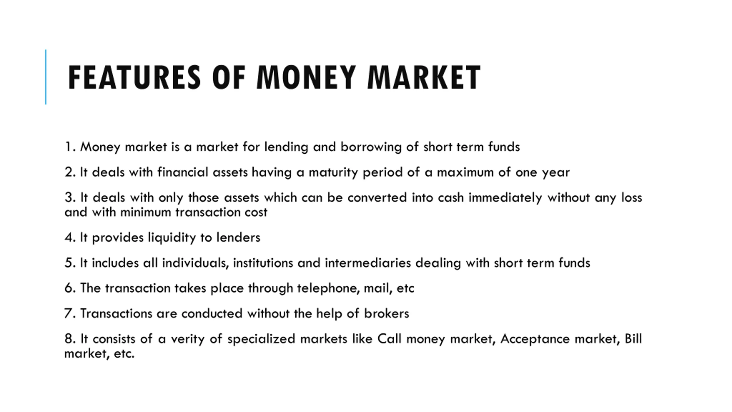 FEATURES OF MONEY MARKET 1. Money market is a market for lending and borrowing of short term funds 2. It deals with financial assets having a maturity period of a maximum of one year 3. It deals with only those assets which can be converted into cash immediately without any loss and with minimum transaction cost 4. It provides liquidity to lenders 5. It includes all individuals, institutions and intermediaries dealing with short term funds 6. The transaction takes place through telephone, mail, etc 7. Transactions are conducted without the help of brokers 8. It consists of a verity of specialized markets like Call money market, Acceptance market, Bill market, etc.