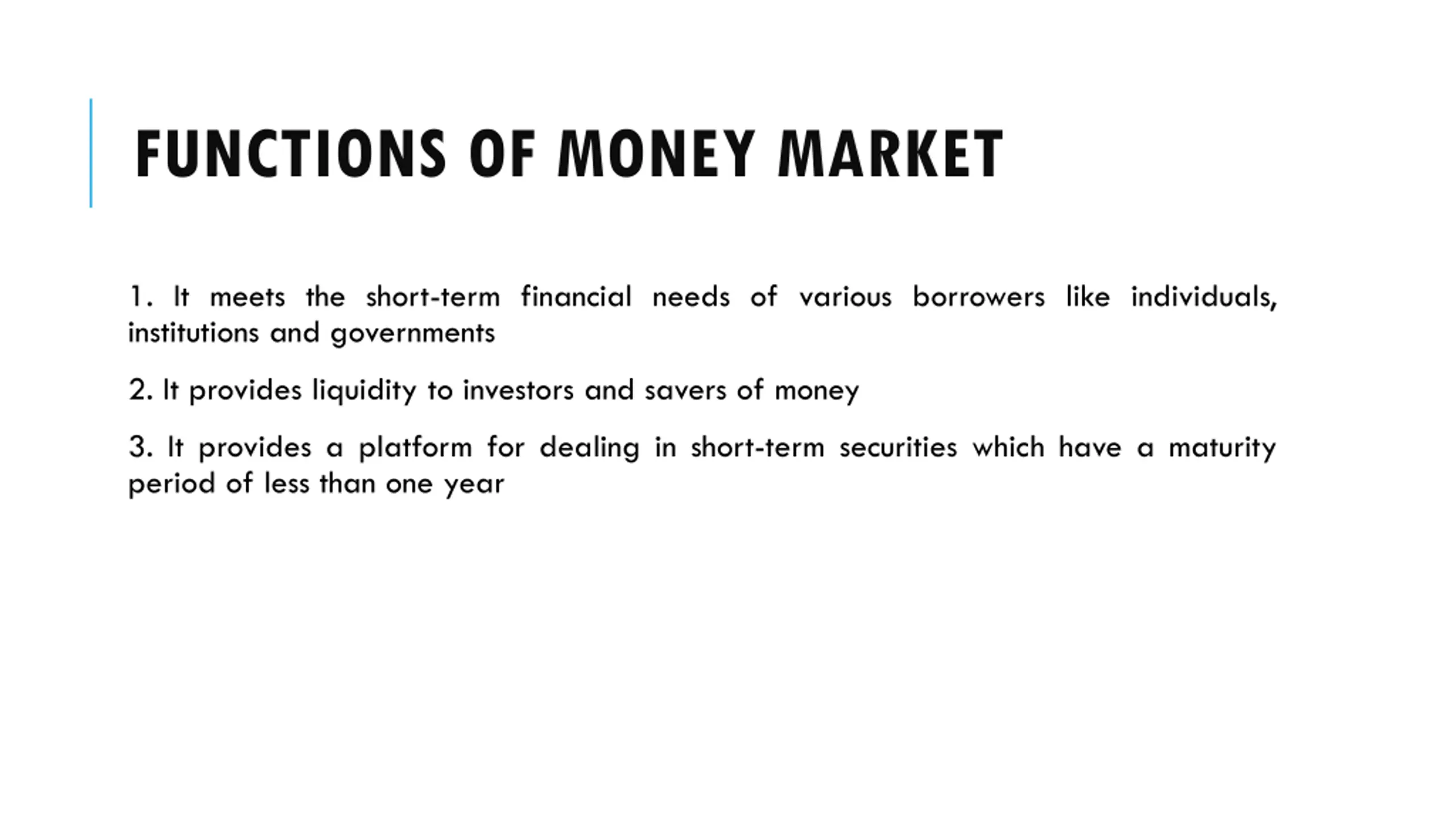 FUNCTIONS OF MONEY MARKET 1. It meets the short-term financial needs of various borrowers like individuals, institutions and governments 2. It provides liquidity to investors and savers of money 3. It provides a platform for dealing in short-term securities which have a maturity period of less than one year