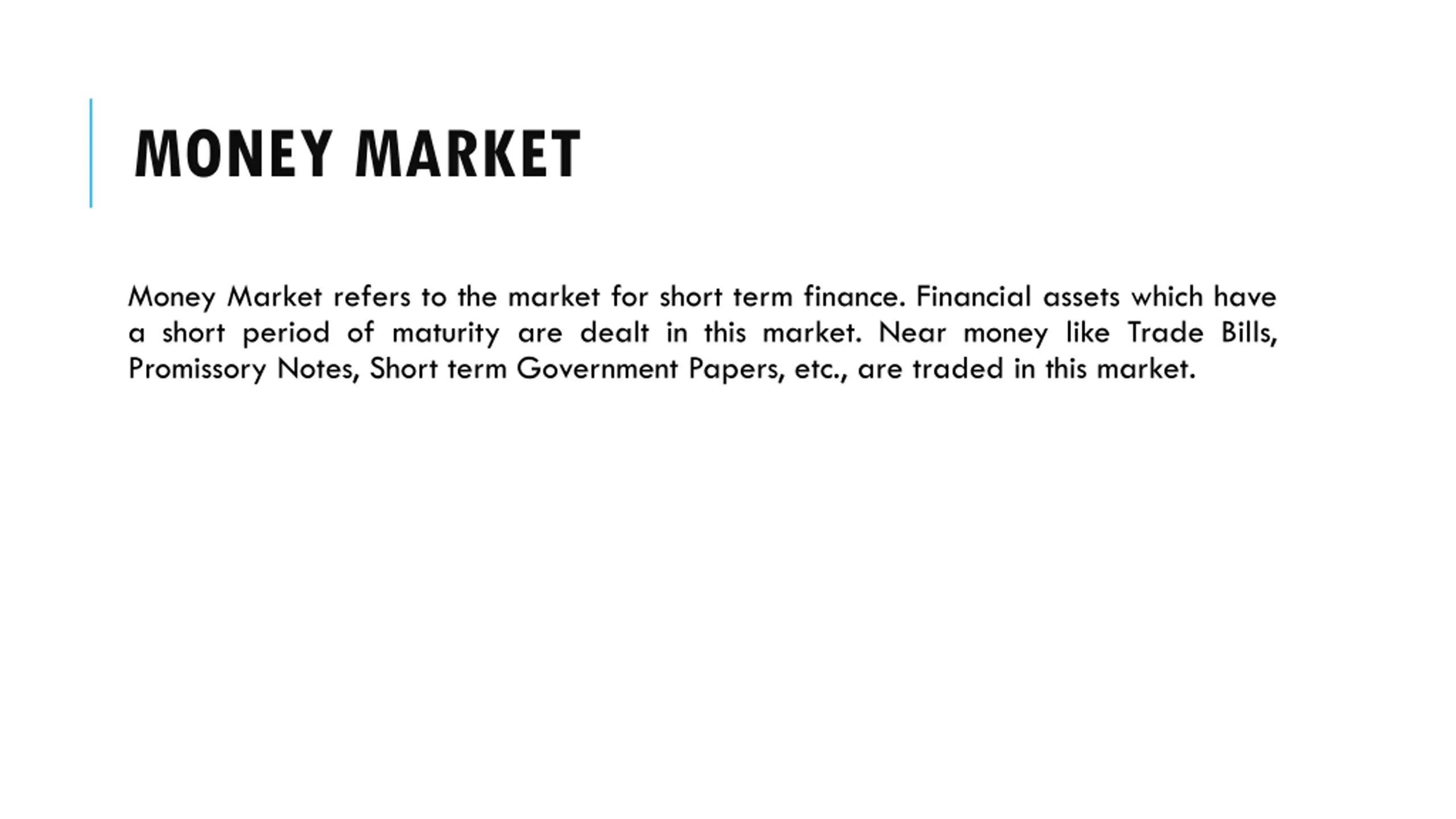 MONEY MARKET Money Market refers to the market for short term finance. Financial assets which have a short period of maturity are dealt in this market. Near money like Trade Bills, Promissory Notes, Short term Government Papers, etc., are traded in this market.