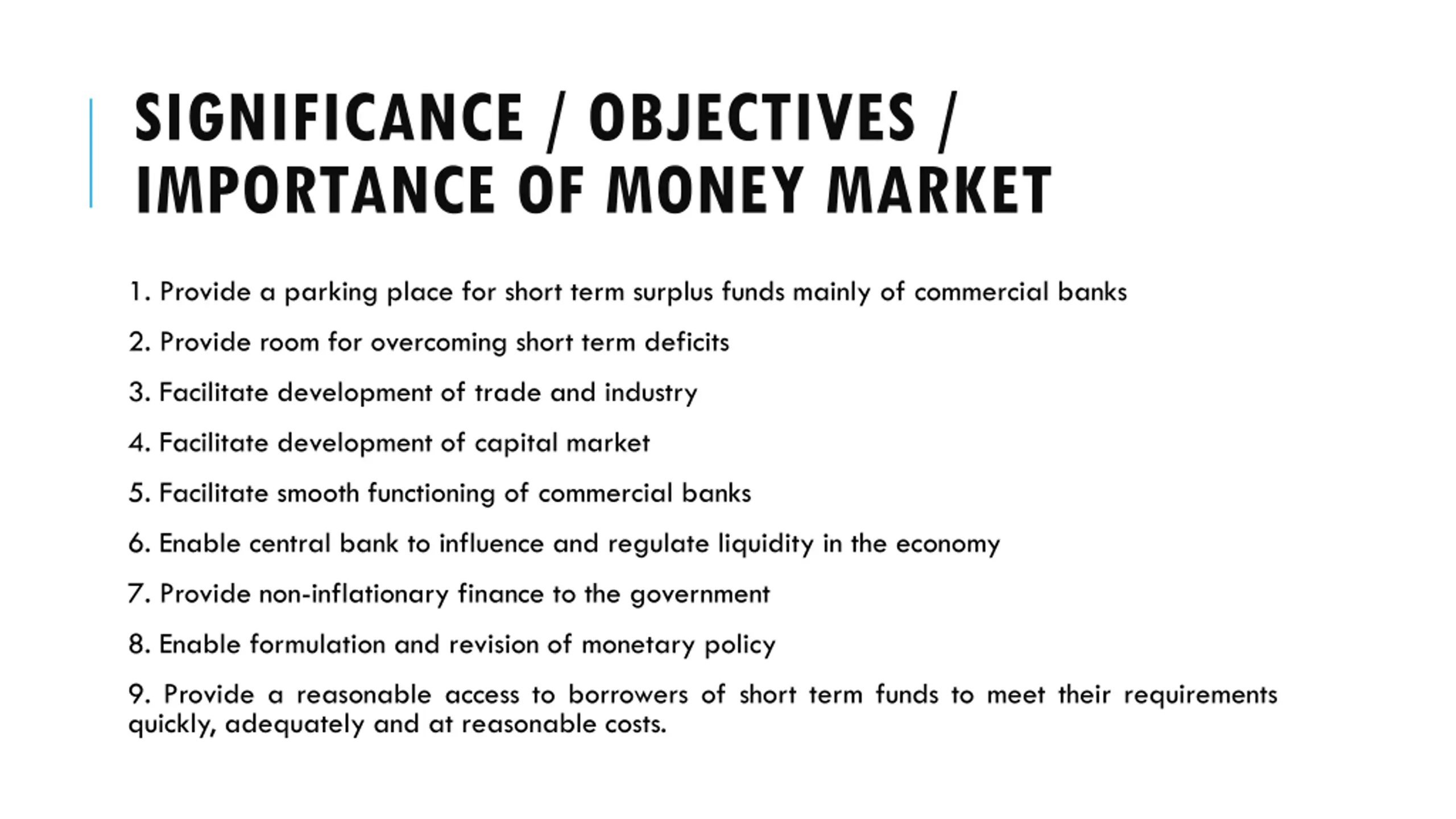 SIGNIFICANCE / OBJECTIVES / IMPORTANCE OF MONEY MARKET 1. Provide a parking place for short term surplus funds mainly of commercial banks 2. Provide room for overcoming short term deficits 3. Facilitate development of trade and industry 4. Facilitate development of capital market 5. Facilitate smooth functioning of commercial banks 6. Enable central bank to influence and regulate liquidity in the economy 7. Provide non-inflationary finance to the government 8. Enable formulation and revision of monetary policy 9. Provide a reasonable access to borrowers of short term funds to meet their requirements quickly, adequately and at reasonable costs.
