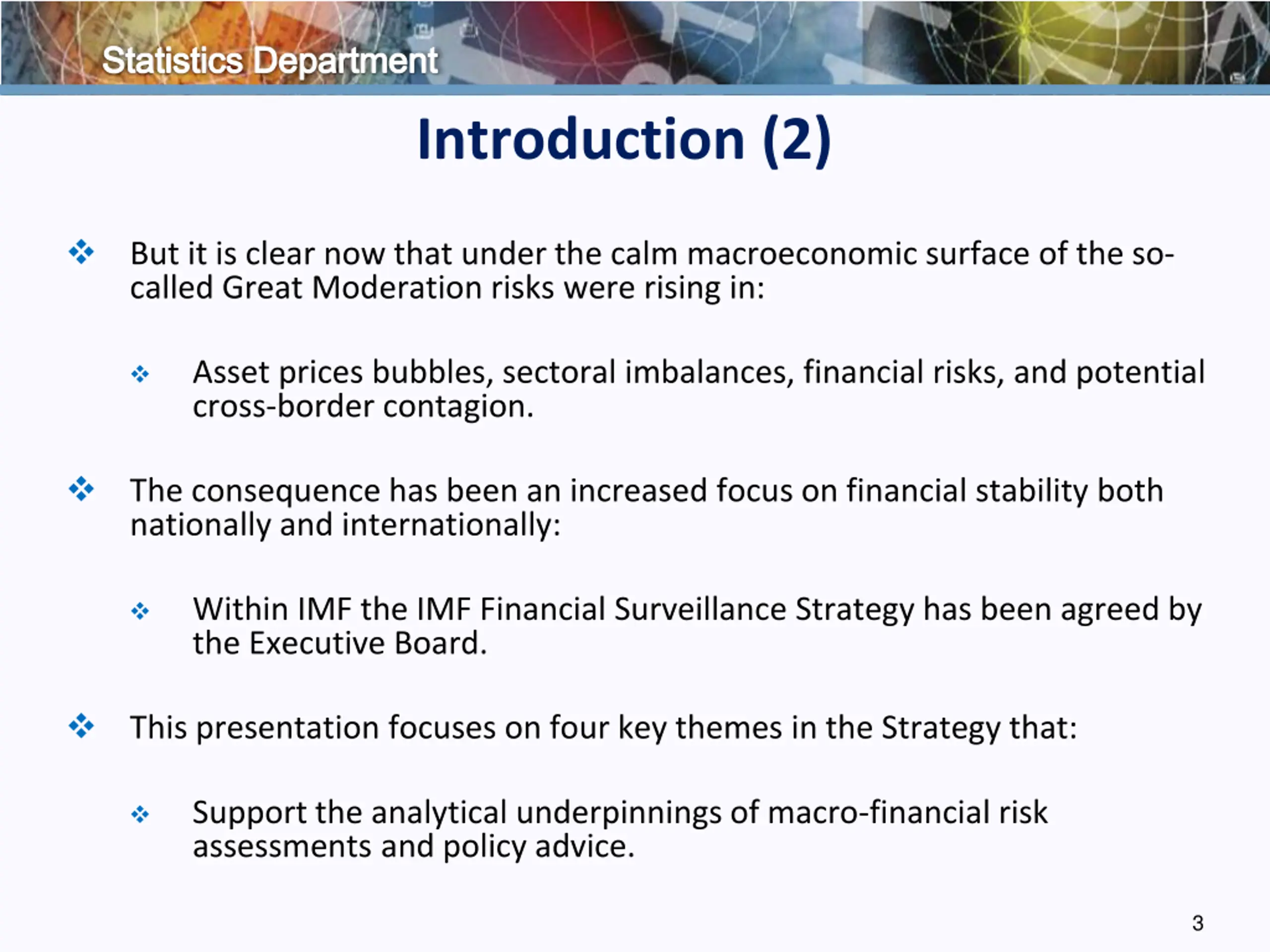 Statistics Department Introduction (2) But it is clear now that under the calm macroeconomic surface of the so- called Great Moderation risks were rising in: Asset prices bubbles, sectoral imbalances, financial risks, and potential cross-border contagion. The consequence has been an increased focus on financial stability both nationally and internationally: Within IMF the IMF Financial Surveillance Strategy has been agreed by the Executive Board. This presentation focuses on four key themes in the Strategy that: Support the analytical underpinnings of macro-financial risk assessments and policy advice. 3