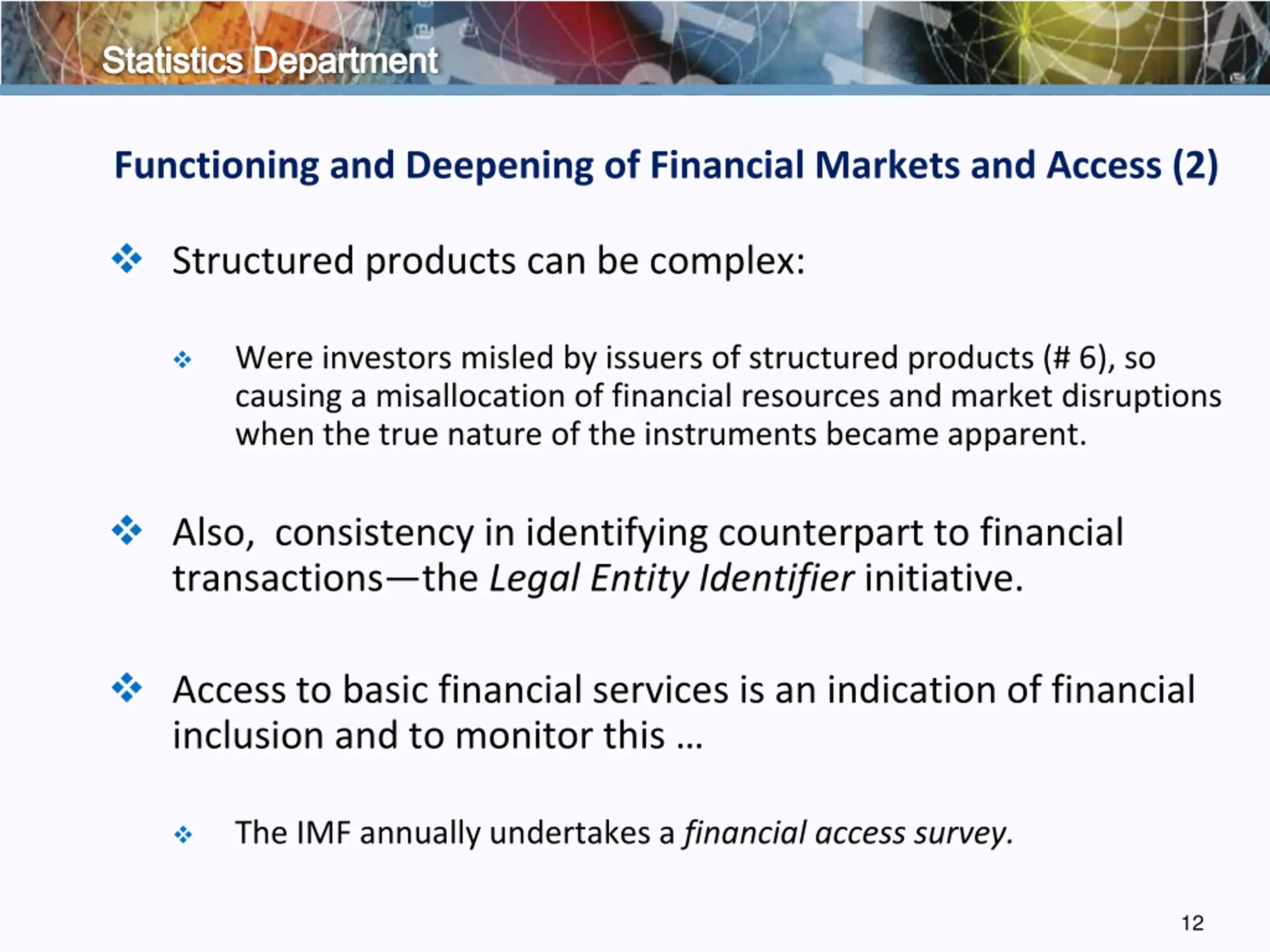 Statistics Department Functioning and Deepening of Financial Markets and Access (2) Structured products can be complex: Were investors misled by issuers of structured products (# 6), so causing a misallocation of financial resources and market disruptions when the true nature of the instruments became apparent. Also, consistency in identifying counterpart to financial transactions the Legal Entity Identifier initiative. Access to basic financial services is an indication of financial inclusion and to monitor this The IMF annually undertakes a financial access survey. 12