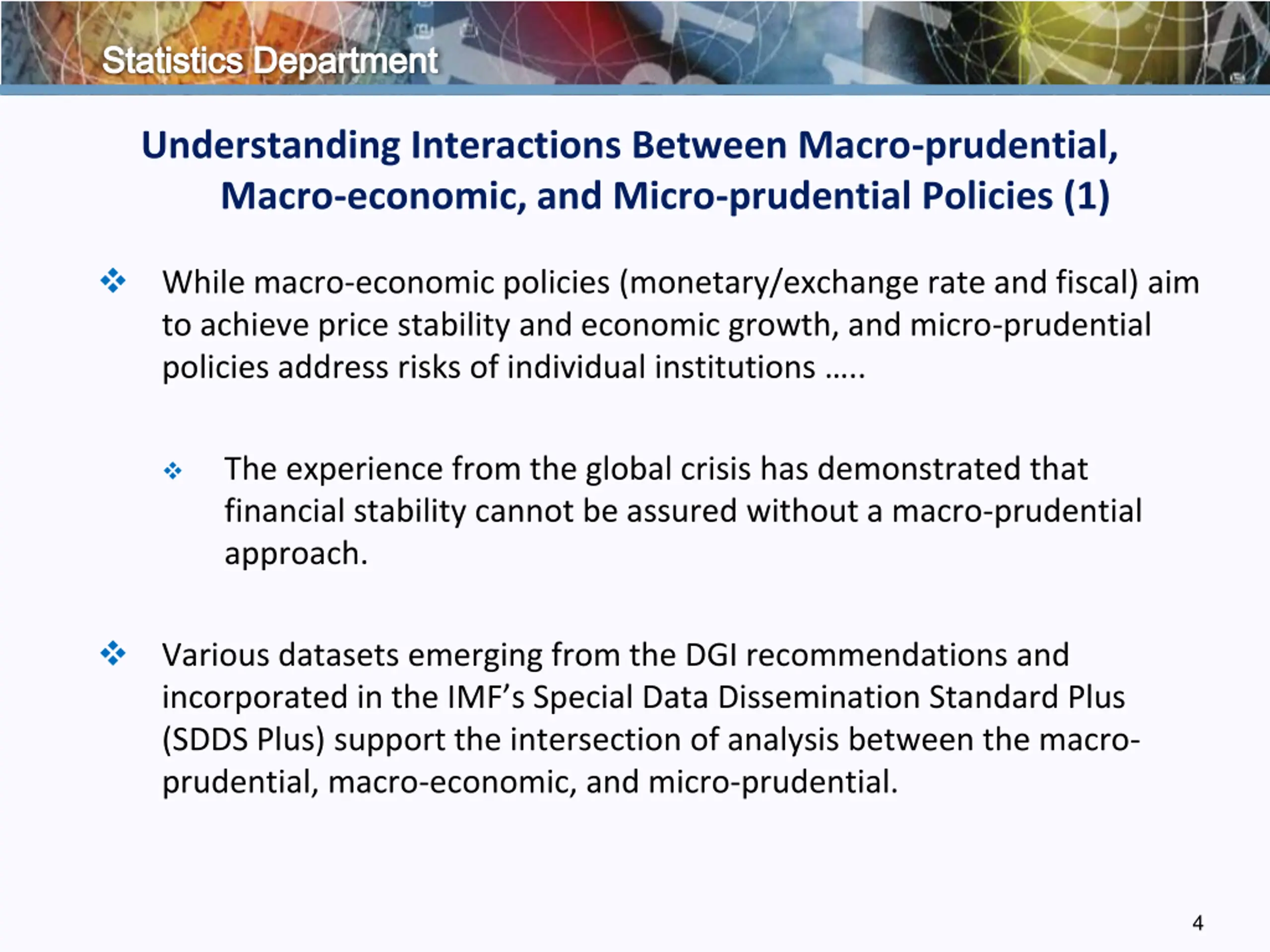 Statistics Department Understanding Interactions Between Macro-prudential, Macro-economic, and Micro-prudential Policies (1) While macro-economic policies (monetary/exchange rate and fiscal) aim to achieve price stability and economic growth, and micro-prudential policies address risks of individual institutions .. The experience from the global crisis has demonstrated that financial stability cannot be assured without a macro-prudential approach. Various datasets emerging from the DGI recommendations and incorporated in the IMF s Special Data Dissemination Standard Plus (SDDS Plus) support the intersection of analysis between the macro- prudential, macro-economic, and micro-prudential. 4