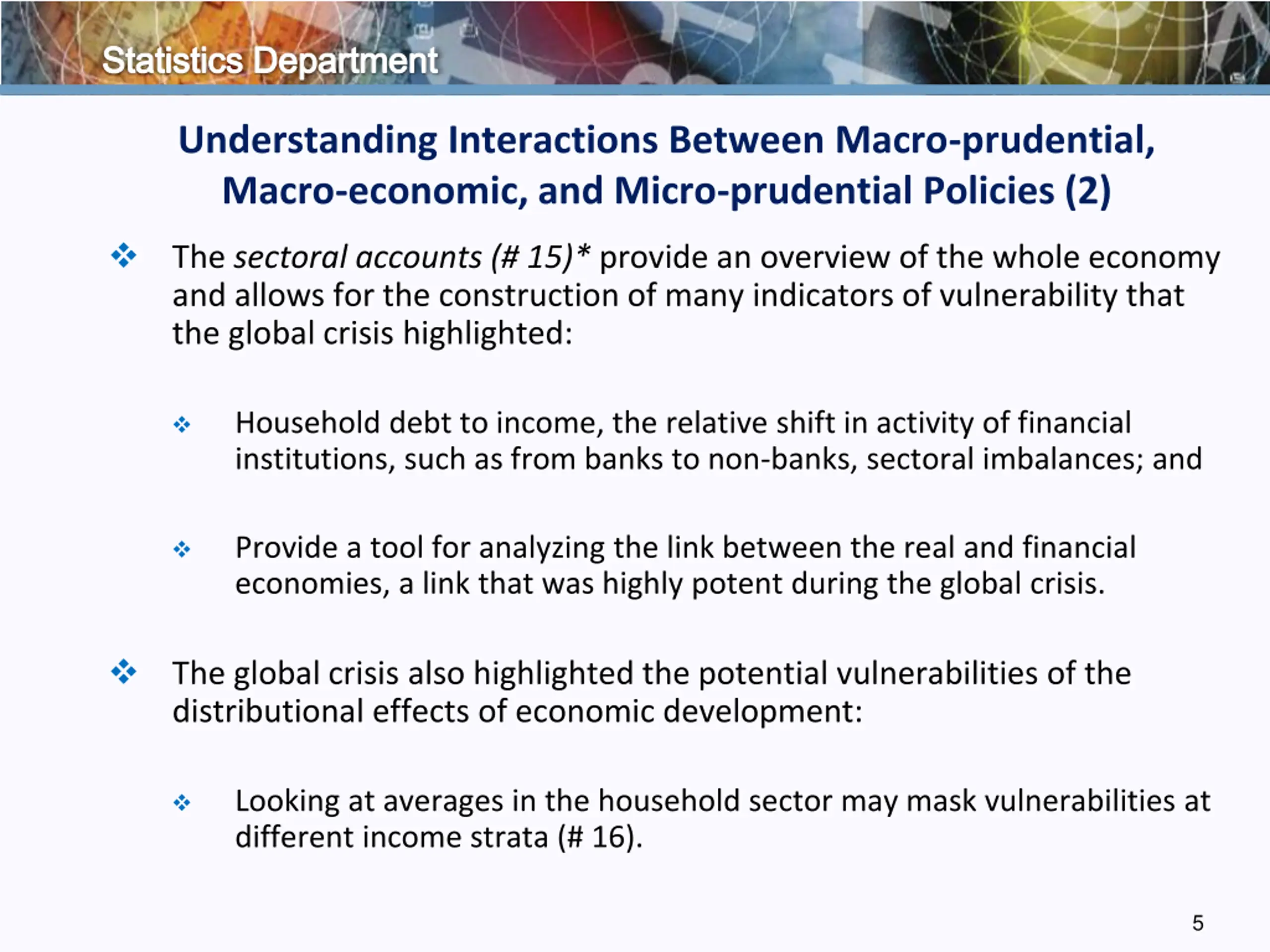 Statistics Department Understanding Interactions Between Macro-prudential, Macro-economic, and Micro-prudential Policies (2) The sectoral accounts (# 15)* provide an overview of the whole economy and allows for the construction of many indicators of vulnerability that the global crisis highlighted: Household debt to income, the relative shift in activity of financial institutions, such as from banks to non-banks, sectoral imbalances; and Provide a tool for analyzing the link between the real and financial economies, a link that was highly potent during the global crisis. The global crisis also highlighted the potential vulnerabilities of the distributional effects of economic development: Looking at averages in the household sector may mask vulnerabilities at different income strata (# 16). 5