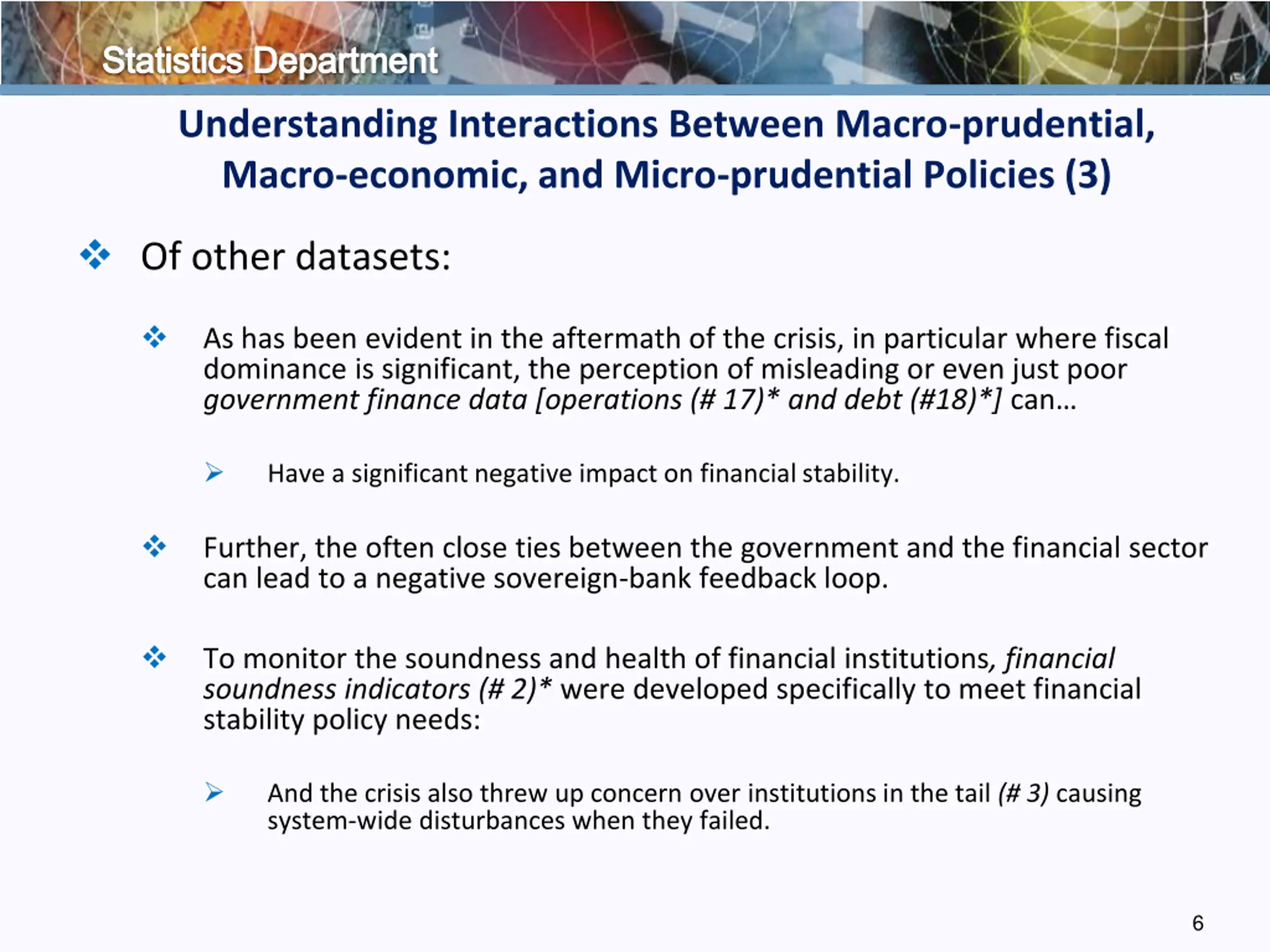 Statistics Department Understanding Interactions Between Macro-prudential, Macro-economic, and Micro-prudential Policies (3) Of other datasets: As has been evident in the aftermath of the crisis, in particular where fiscal dominance is significant, the perception of misleading or even just poor government finance data [operations (# 17)* and debt (#18)*] can Have a significant negative impact on financial stability. Further, the often close ties between the government and the financial sector can lead to a negative sovereign-bank feedback loop. To monitor the soundness and health of financial institutions, financial soundness indicators (# 2)* were developed specifically to meet financial stability policy needs: And the crisis also threw up concern over institutions in the tail (# 3) causing system-wide disturbances when they failed. 6