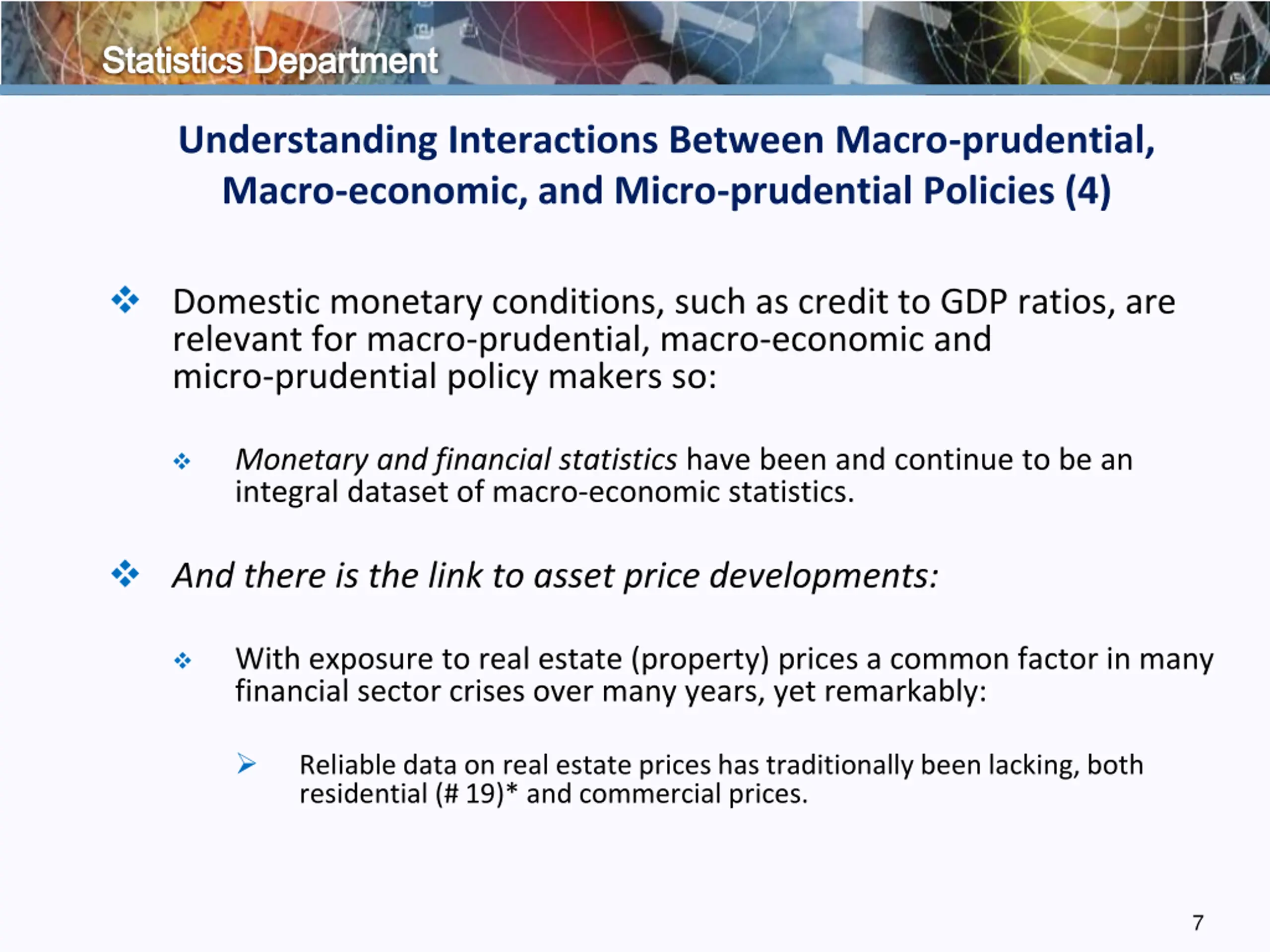 Statistics Department Understanding Interactions Between Macro-prudential, Macro-economic, and Micro-prudential Policies (4) Domestic monetary conditions, such as credit to GDP ratios, are relevant for macro-prudential, macro-economic and micro-prudential policy makersso: Monetary and financial statistics have been and continue to be an integral dataset of macro-economic statistics. And there is the link to asset price developments: With exposure to real estate (property) prices a common factor in many financial sector crises over many years, yet remarkably: Reliable data on real estate prices has traditionally been lacking, both residential (# 19)* and commercial prices. 7
