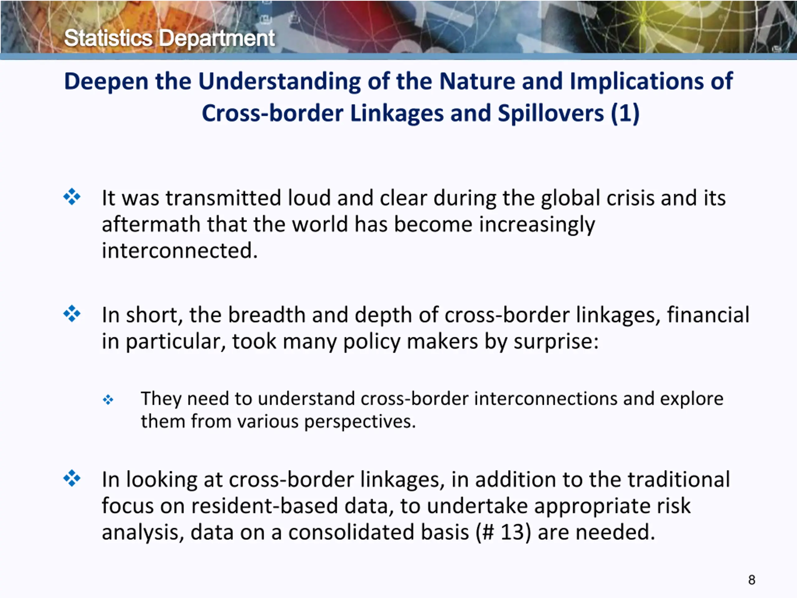 Statistics Department Deepen the Understanding of the Nature and Implications of Cross-border Linkages and Spillovers (1) It was transmitted loud and clear during the global crisis and its aftermath that the world has become increasingly interconnected. In short, the breadth and depth of cross-border linkages, financial in particular, took many policy makers by surprise: They need to understand cross-border interconnections and explore them from various perspectives. In looking at cross-border linkages, in addition to the traditional focus on resident-based data, to undertake appropriate risk analysis, data on a consolidated basis (# 13) are needed. 8