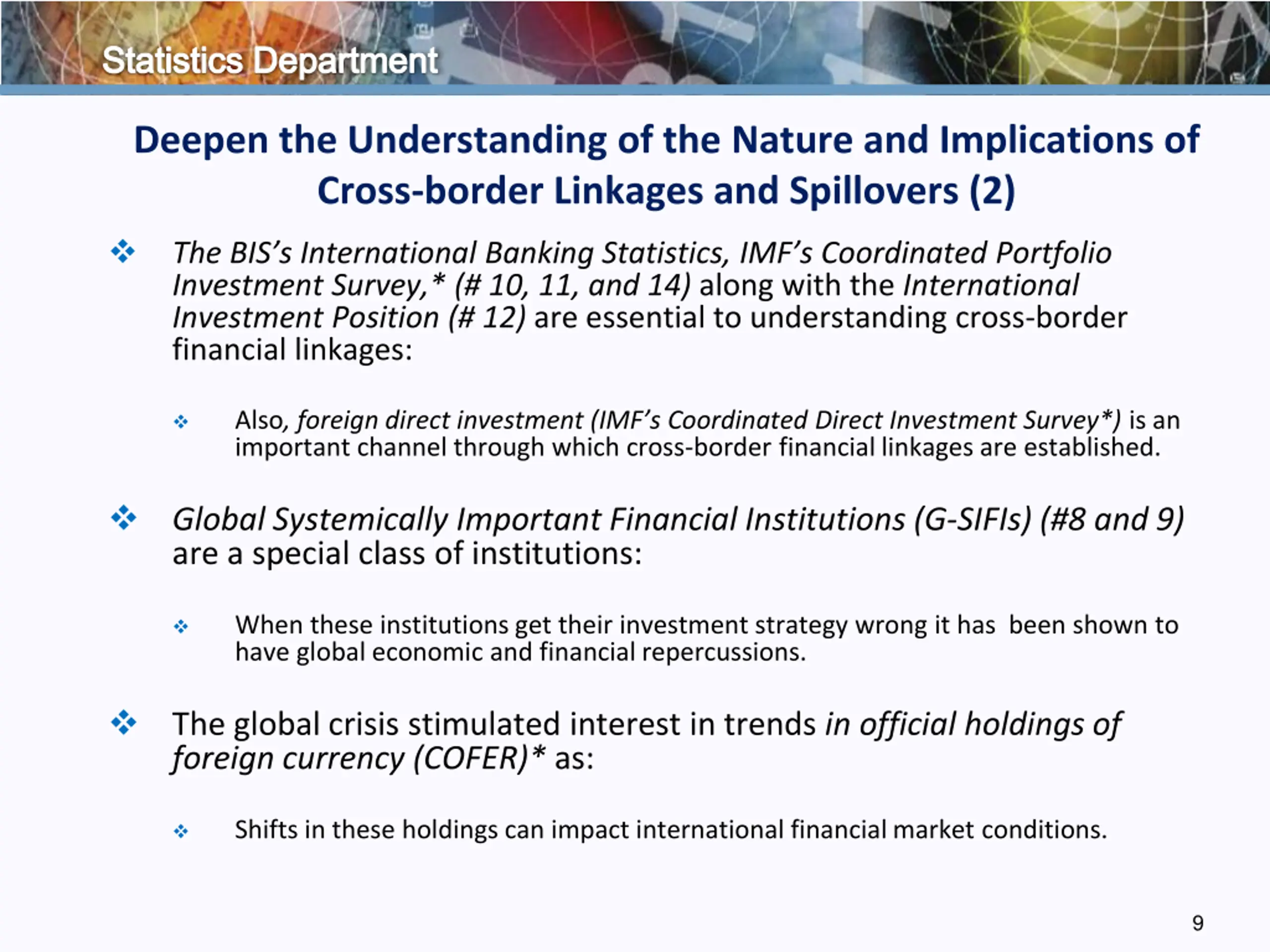 Statistics Department Deepen the Understanding of the Nature and Implications of Cross-border Linkages and Spillovers (2) The BIS s International Banking Statistics, IMF s Coordinated Portfolio Investment Survey,* (# 10, 11, and 14) along with the International Investment Position (# 12) are essential to understanding cross-border financial linkages: Also, foreign direct investment (IMF s Coordinated Direct Investment Survey*) is an important channel through which cross-border financial linkages are established. Global Systemically Important Financial Institutions (G-SIFIs) (#8 and 9) are a special class of institutions: When these institutions get their investment strategy wrong it has been shown to have global economic and financial repercussions. The global crisis stimulated interest in trends in official holdings of foreign currency (COFER)* as: Shifts in these holdings can impact international financial market conditions. 9