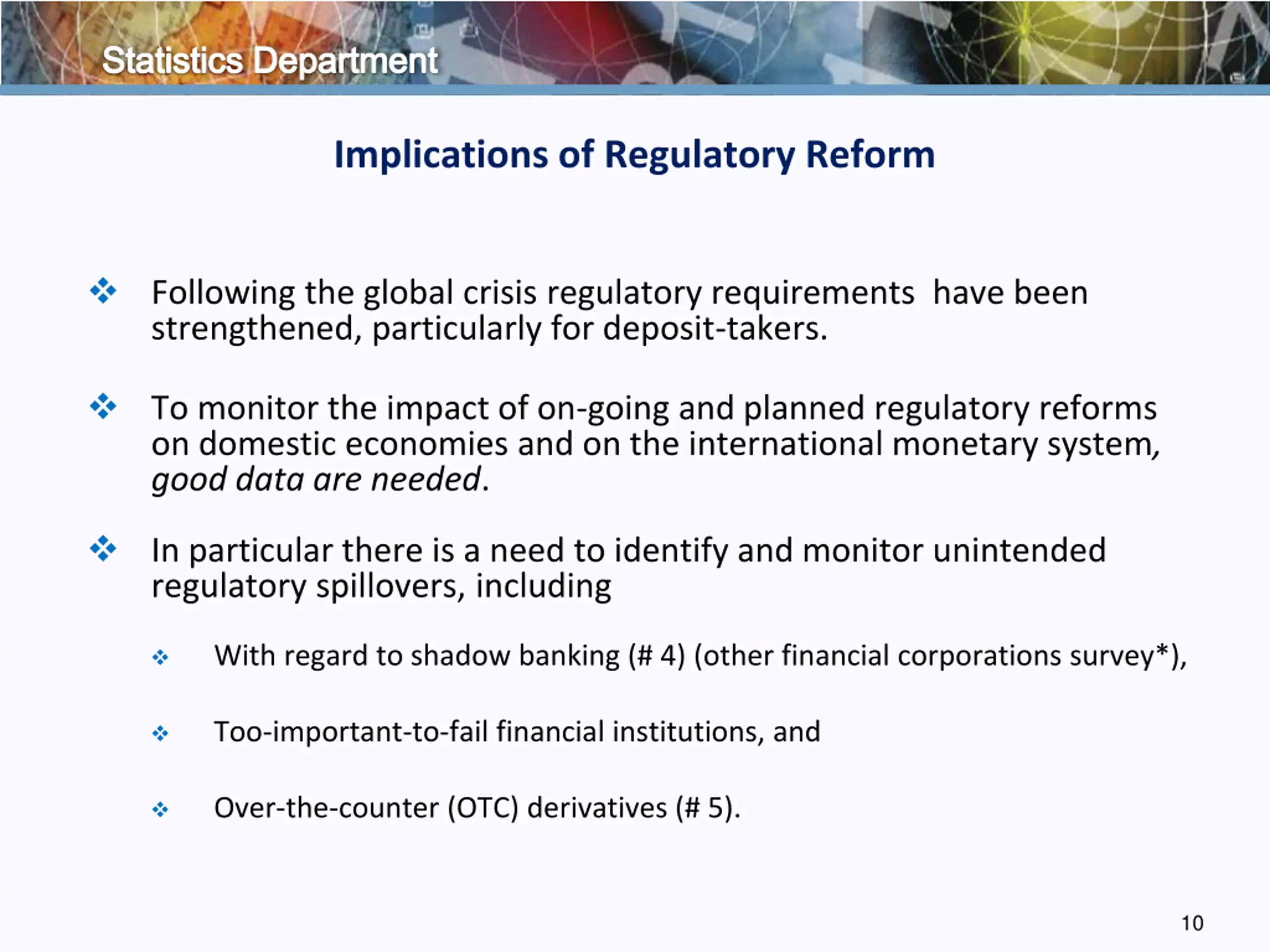 Statistics Department Implications of Regulatory Reform Following the global crisis regulatory requirements have been strengthened, particularly for deposit-takers. To monitor the impact of on-going and planned regulatory reforms on domestic economies and on the international monetary system, good data are needed. In particular there is a need to identify and monitor unintended regulatory spillovers, including With regard to shadow banking (# 4) (other financial corporations survey*), Too-important-to-fail financial institutions, and Over-the-counter (OTC) derivatives (# 5). 10