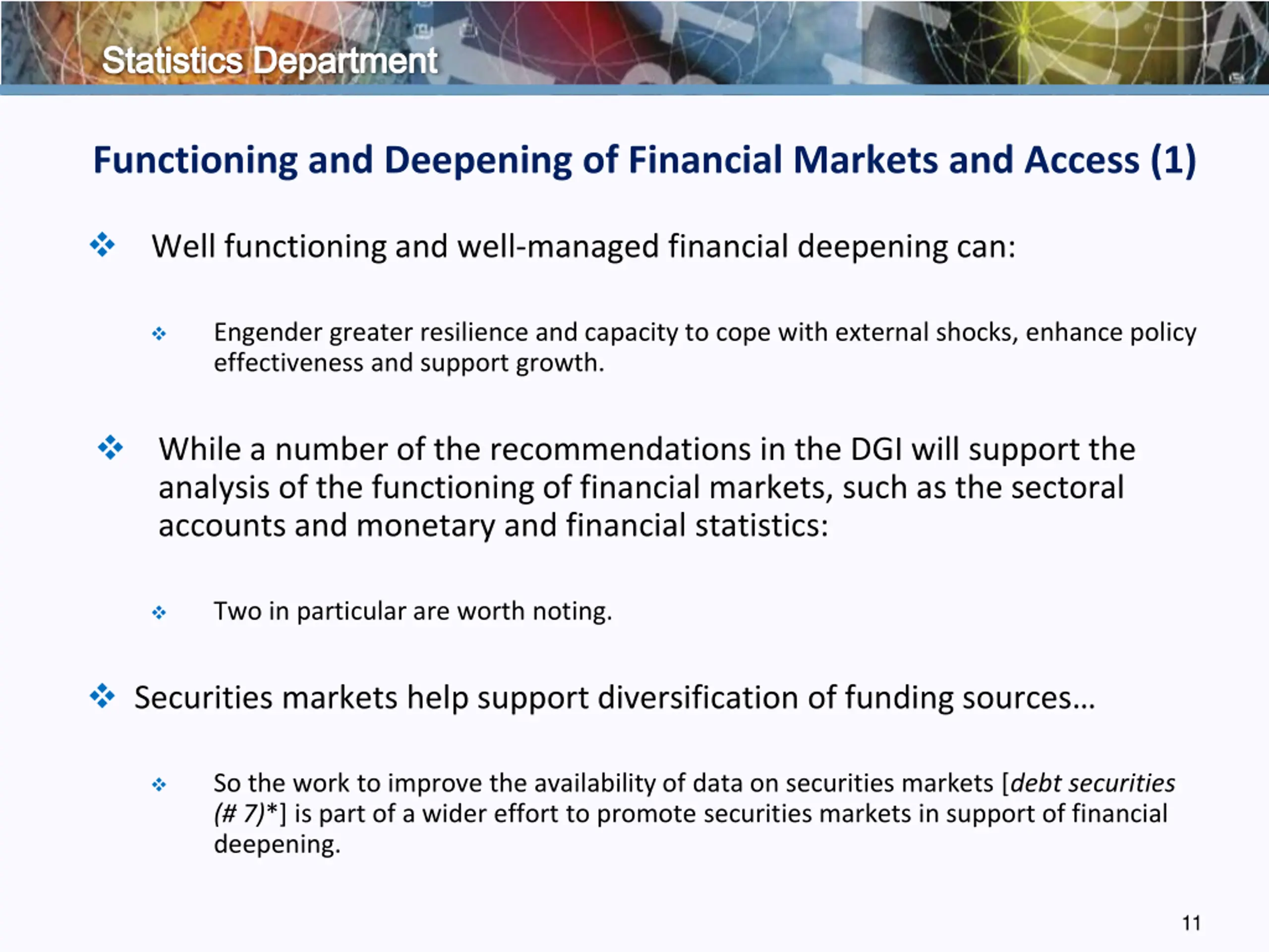 Statistics Department Functioning and Deepening of Financial Markets and Access (1) Well functioning and well-managed financial deepening can: Engender greater resilience and capacity to cope with external shocks, enhance policy effectiveness and support growth. While a number of the recommendations in the DGI will support the analysis of the functioning of financial markets, such as the sectoral accounts and monetary and financial statistics: Two in particular are worth noting. Securities markets help support diversification of funding sources So the work to improve the availability of data on securities markets [debt securities (# 7)*] is part of a wider effort to promote securities markets in support of financial deepening. 11