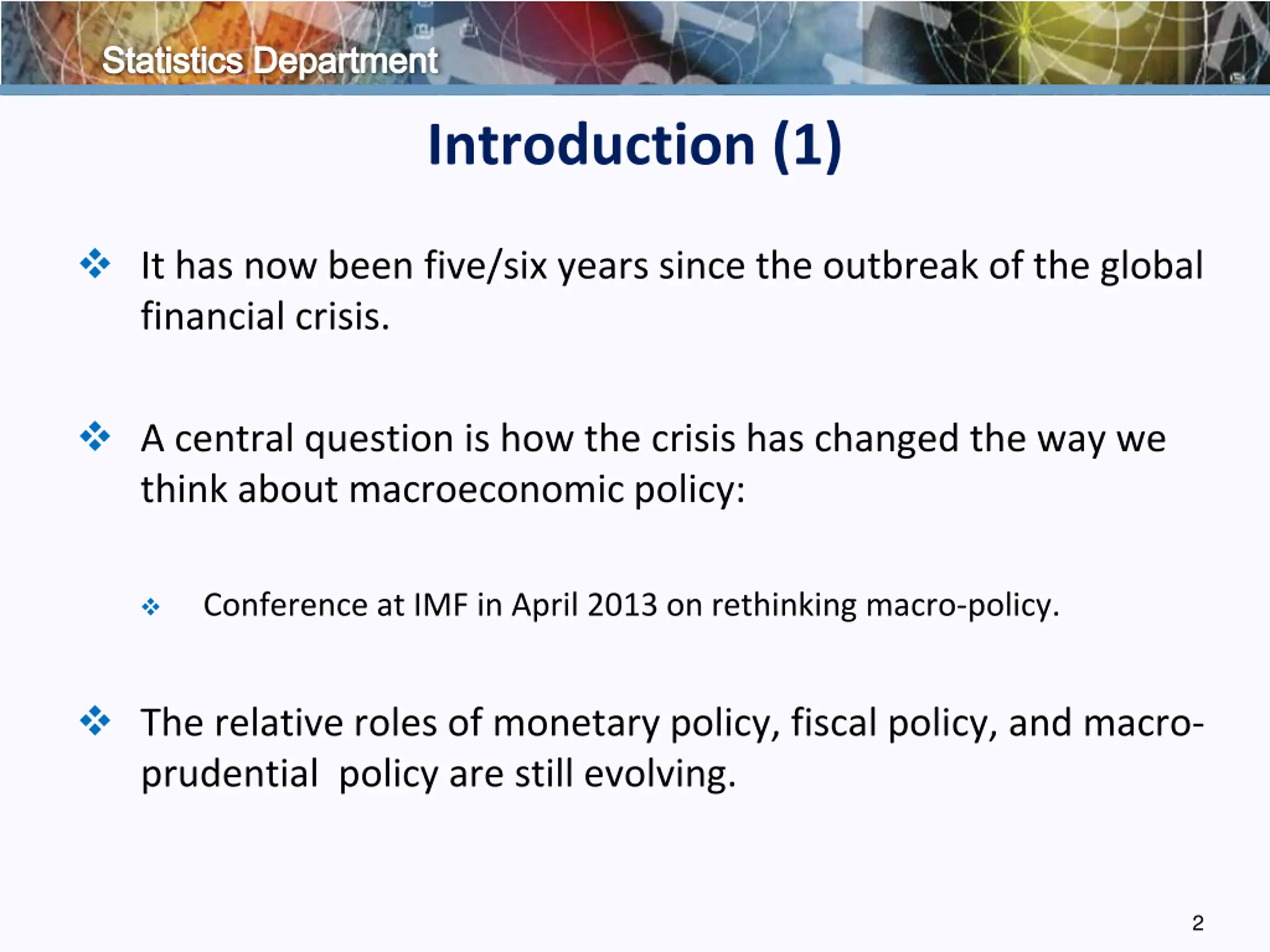 Statistics Department Introduction (1) It has now been five/six years since the outbreak of the global financial crisis. A central question is how the crisis has changed the way we think about macroeconomic policy: Conference at IMF in April 2013 on rethinking macro-policy. The relative roles of monetary policy, fiscal policy, and macro- prudential policy are still evolving. 2