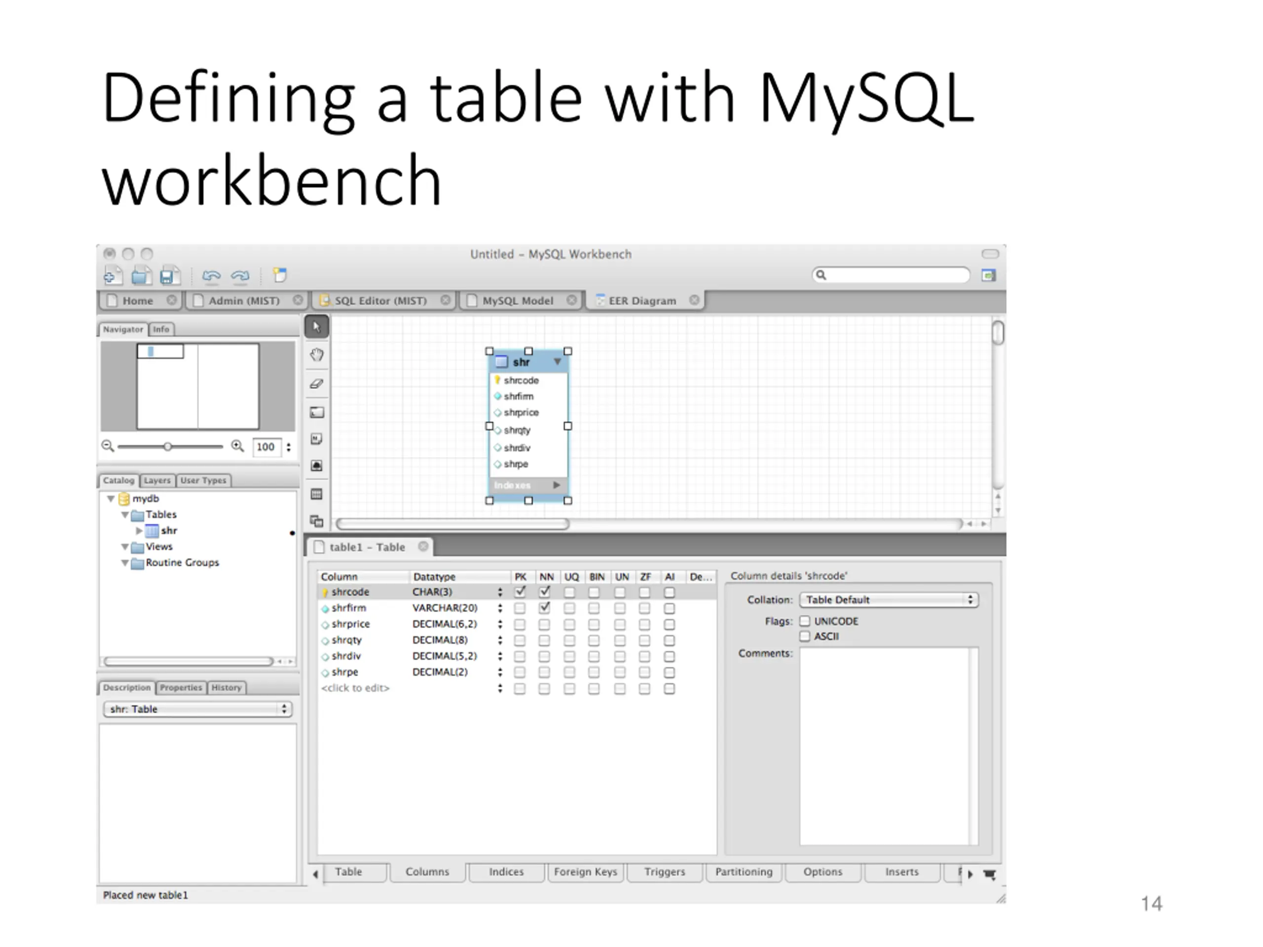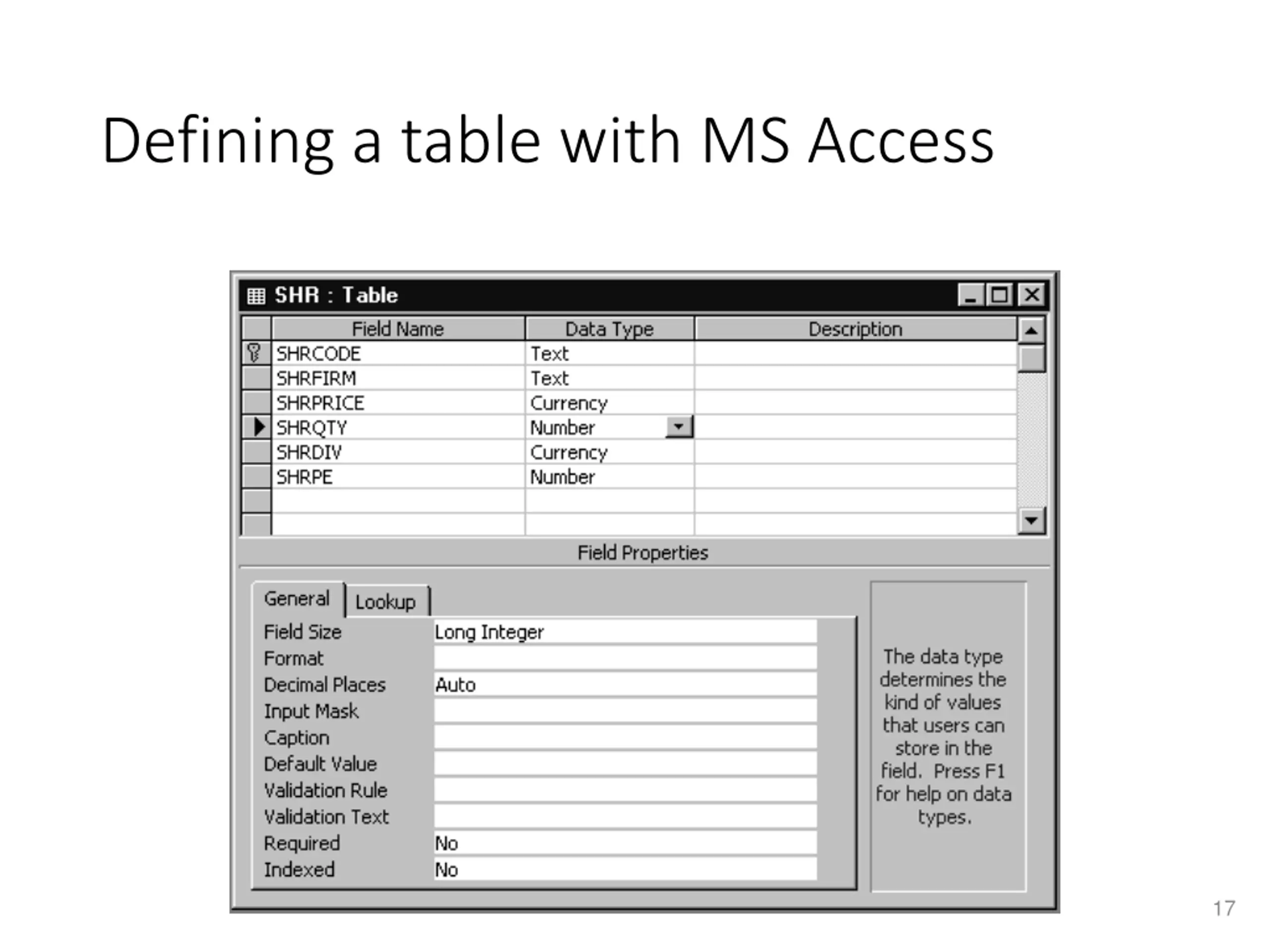 Defining a table CREATE TABLE share ( shrcode shrfirm shrprice shrqty shrdiv shrpe PRIMARY KEY(shrcode)); CHAR(3), VARCHAR(20)NOT NULL, DECIMAL(6,2), DECIMAL(8), DECIMAL(5,2), DECIMAL(2), Are the selected data types a good choice? 12
