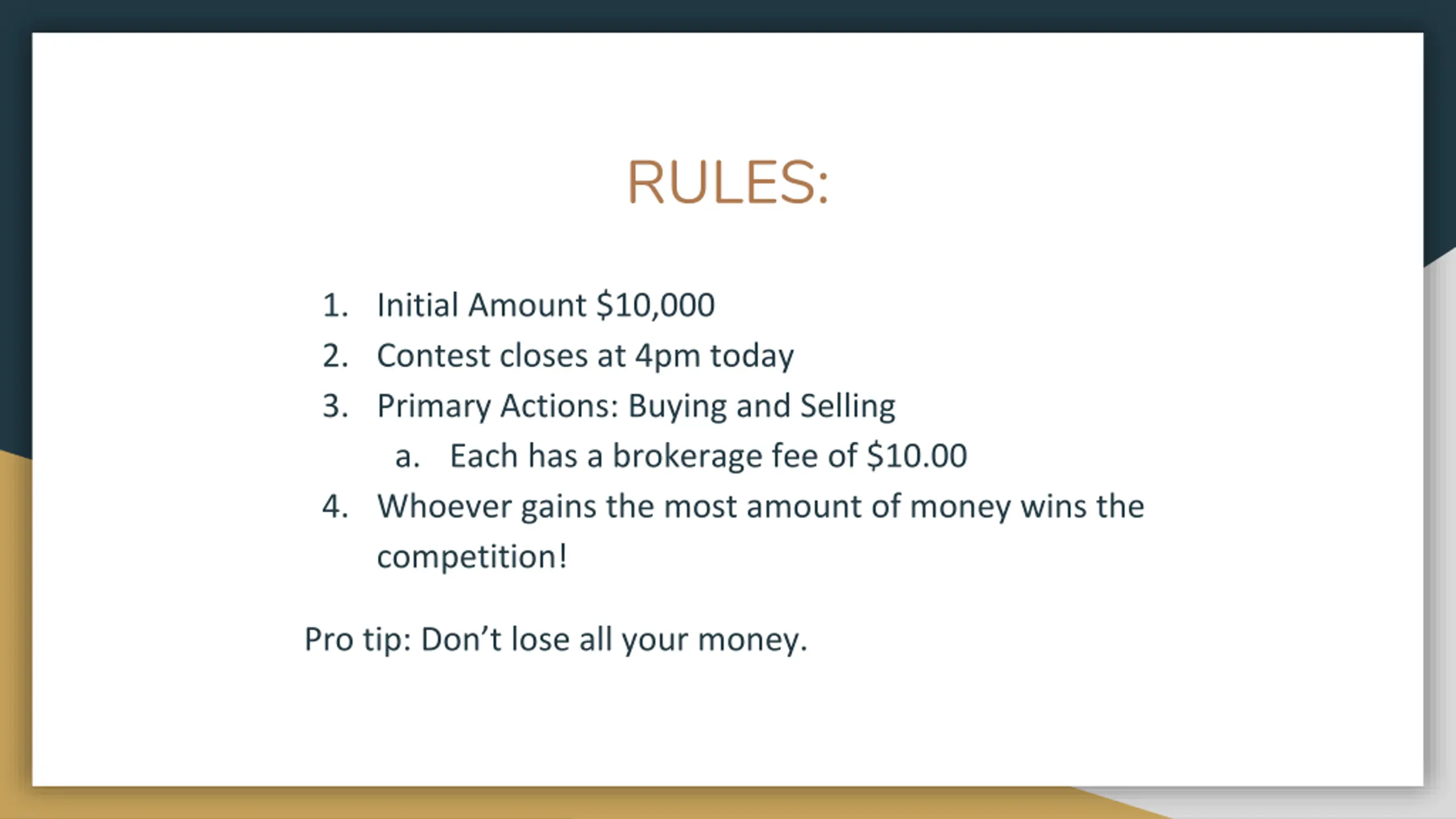 RULES: 1. Initial Amount $10,000 2. Contest closes at 4pm today 3. Primary Actions: Buying and Selling a. Each has a brokerage fee of $10.00 4. Whoever gains the most amount of money wins the competition! Pro tip: Don t lose all your money.