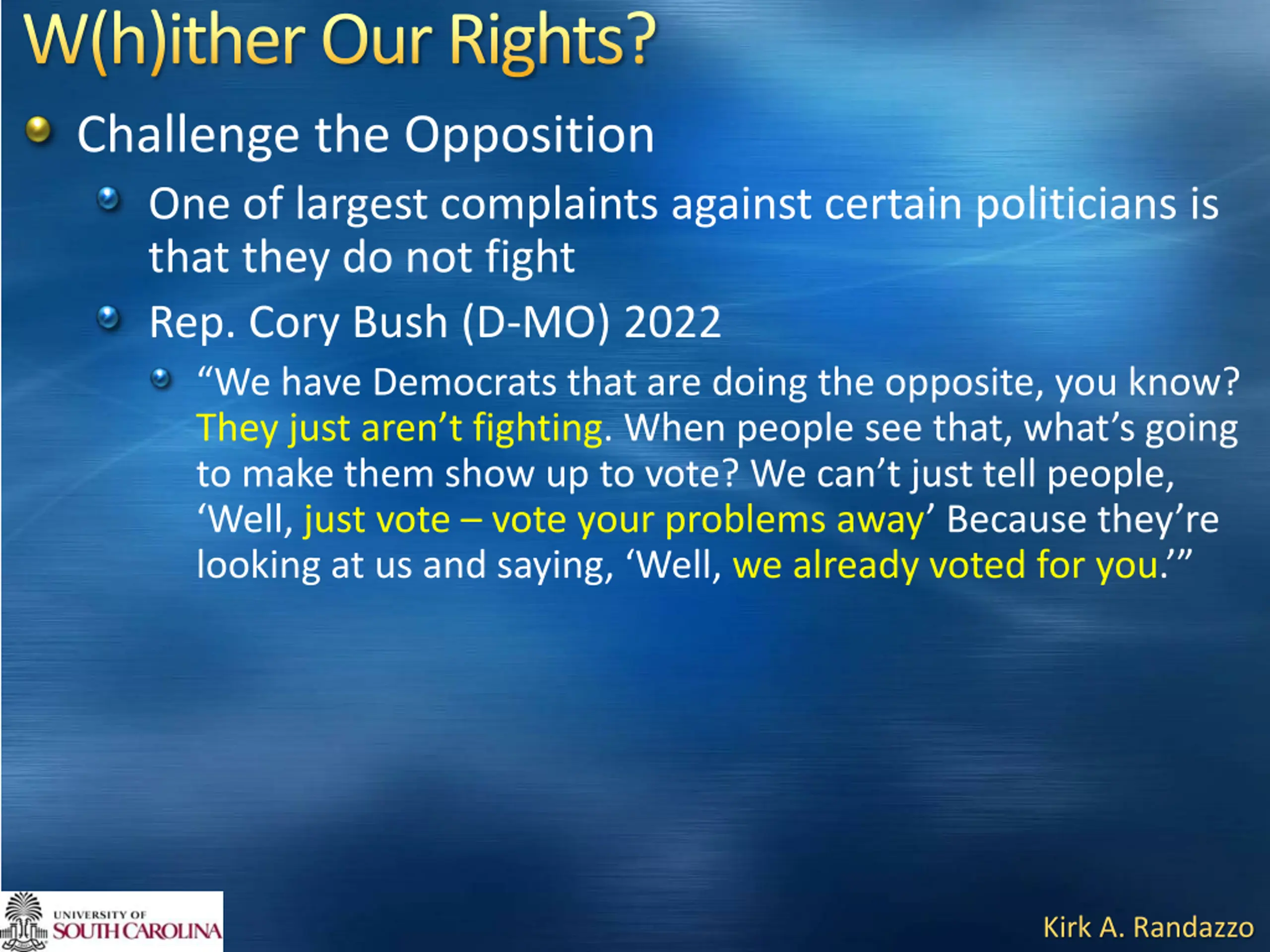 W(h)ither Our Rights? Challenge the Opposition One of largest complaints against certain politicians is that they do not fight Rep. Cory Bush (D-MO) 2022 We have Democrats that are doing the opposite, you know? They just aren t fighting. When people see that, what s going to make them show up to vote? We can t just tell people, Well, just vote vote your problems away Because they re looking at us and saying, Well, we already voted for you. Kirk A. Randazzo