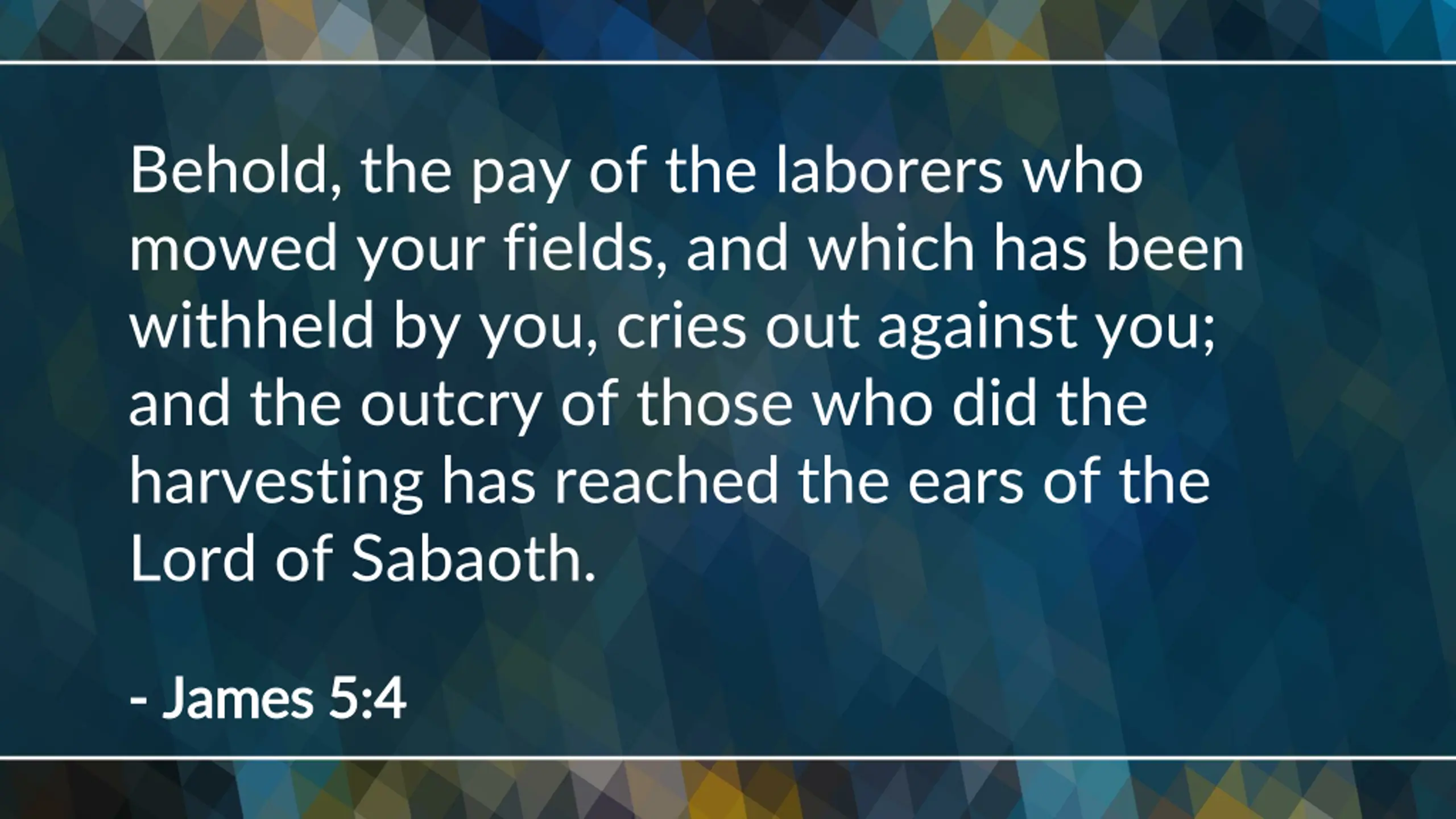 Behold, the pay of the laborers who mowed your fields, and which has been withheld by you, cries out against you; and the outcry of those who did the harvesting has reached the ears of the Lord of Sabaoth. - - James 5:4 James 5:4