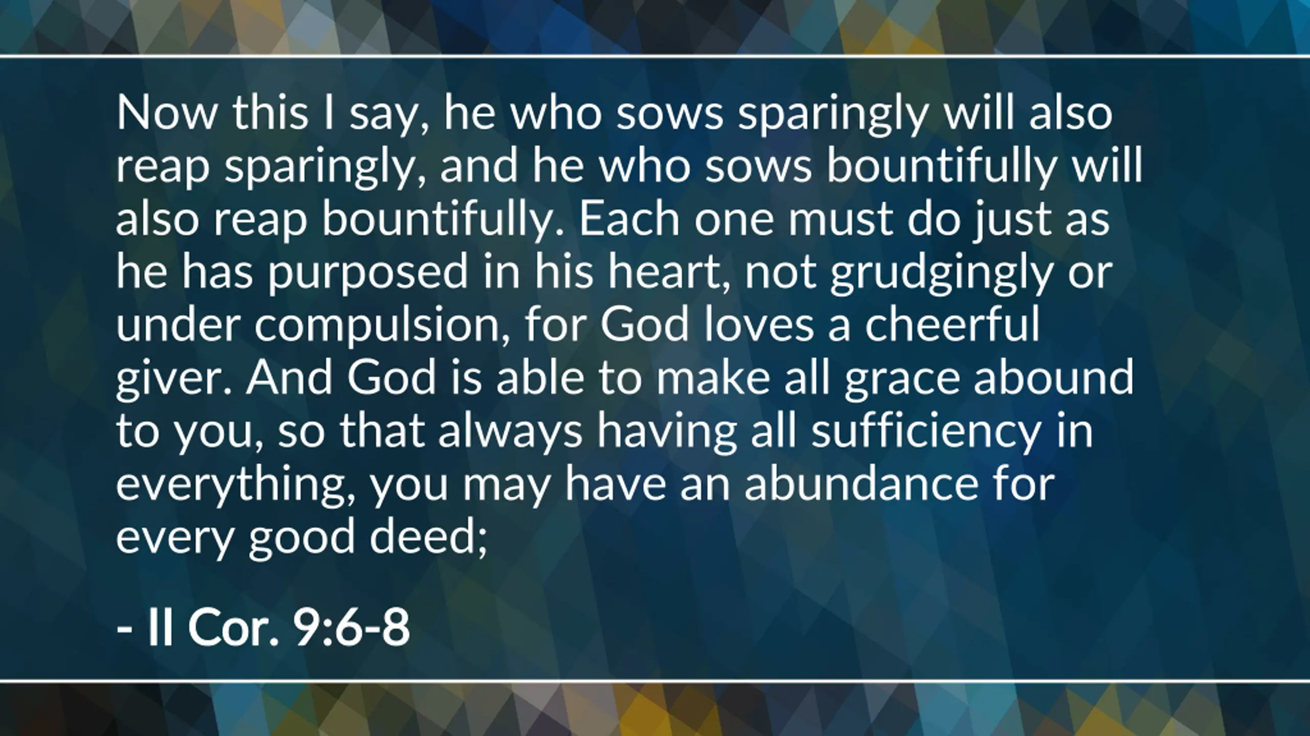 Now this I say, he who sows sparingly will also reap sparingly, and he who sows bountifully will also reap bountifully. Each one must do just as he has purposed in his heart, not grudgingly or under compulsion, for God loves a cheerful giver. And God is able to make all grace abound to you, so that always having all sufficiency in everything, you may have an abundance for every good deed; - - II Cor. 9:6 II Cor. 9:6- -8 8