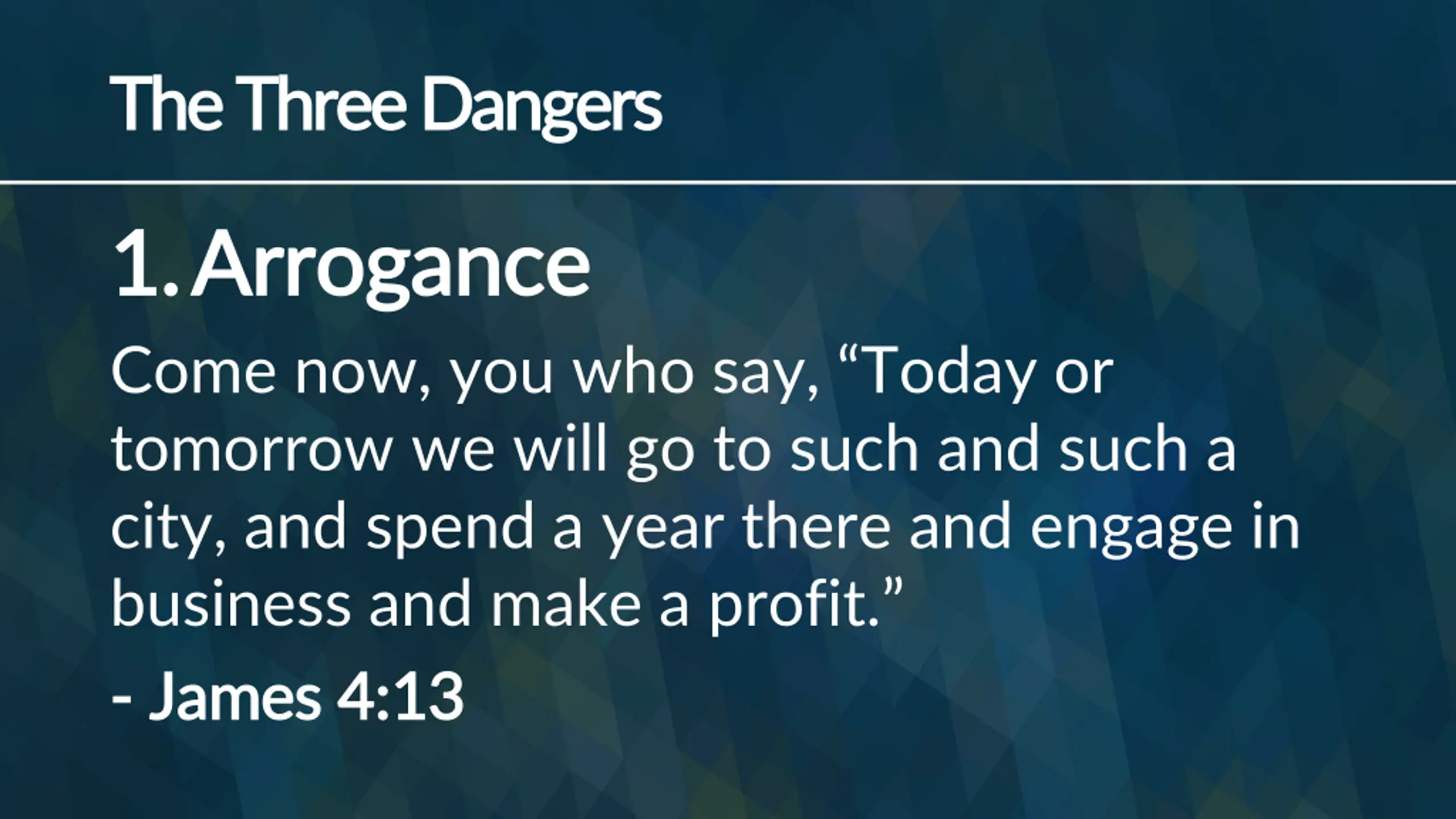 The Three Dangers The Three Dangers 1. 1.Arrogance Arrogance Come now, you who say, Today or tomorrow we will go to such and such a city, and spend a year there and engage in business and make a profit. - - James 4:13 James 4:13