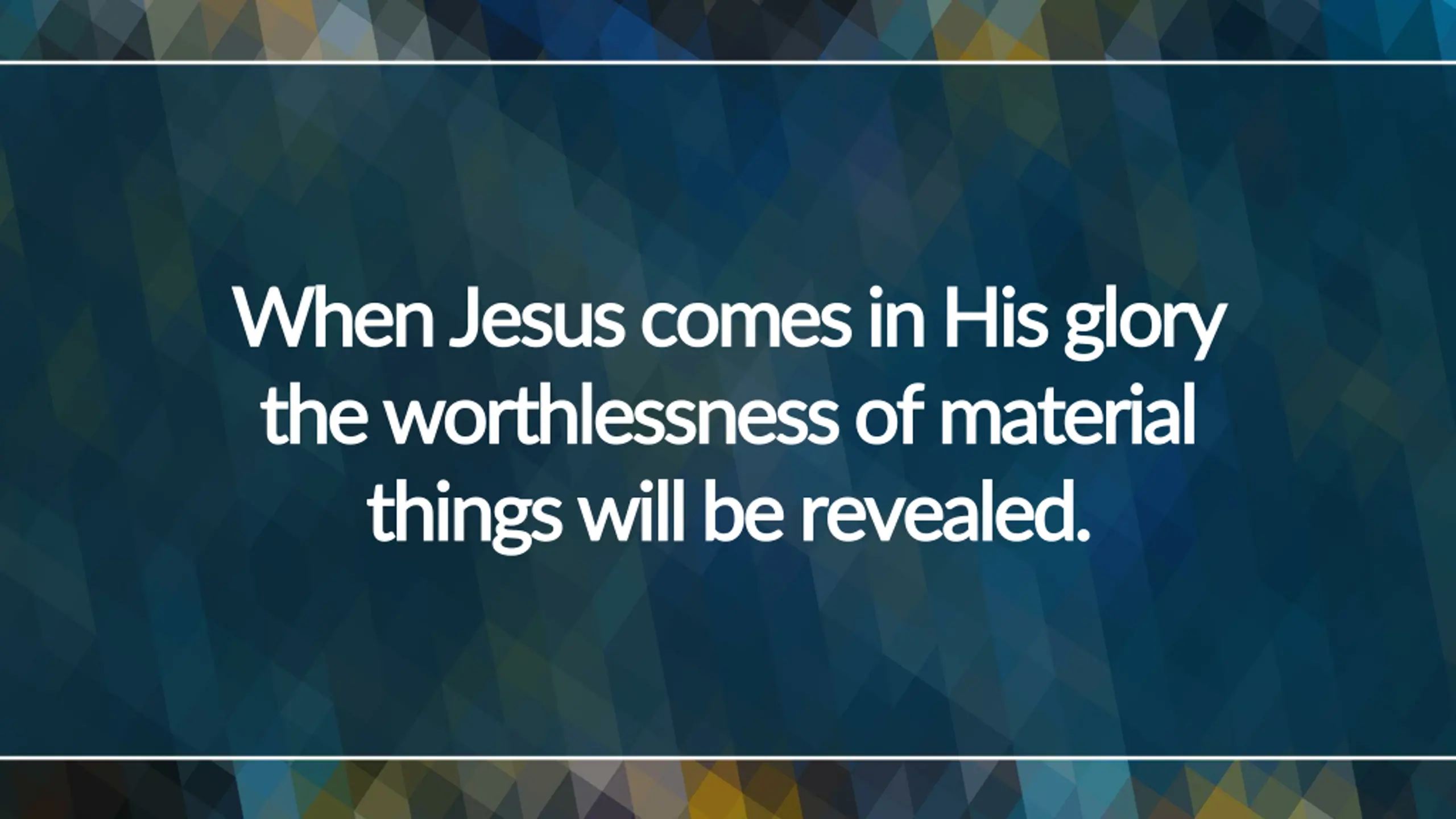 When Jesus comes in His glory When Jesus comes in His glory the worthlessness of material the worthlessness of material things will be revealed. things will be revealed.