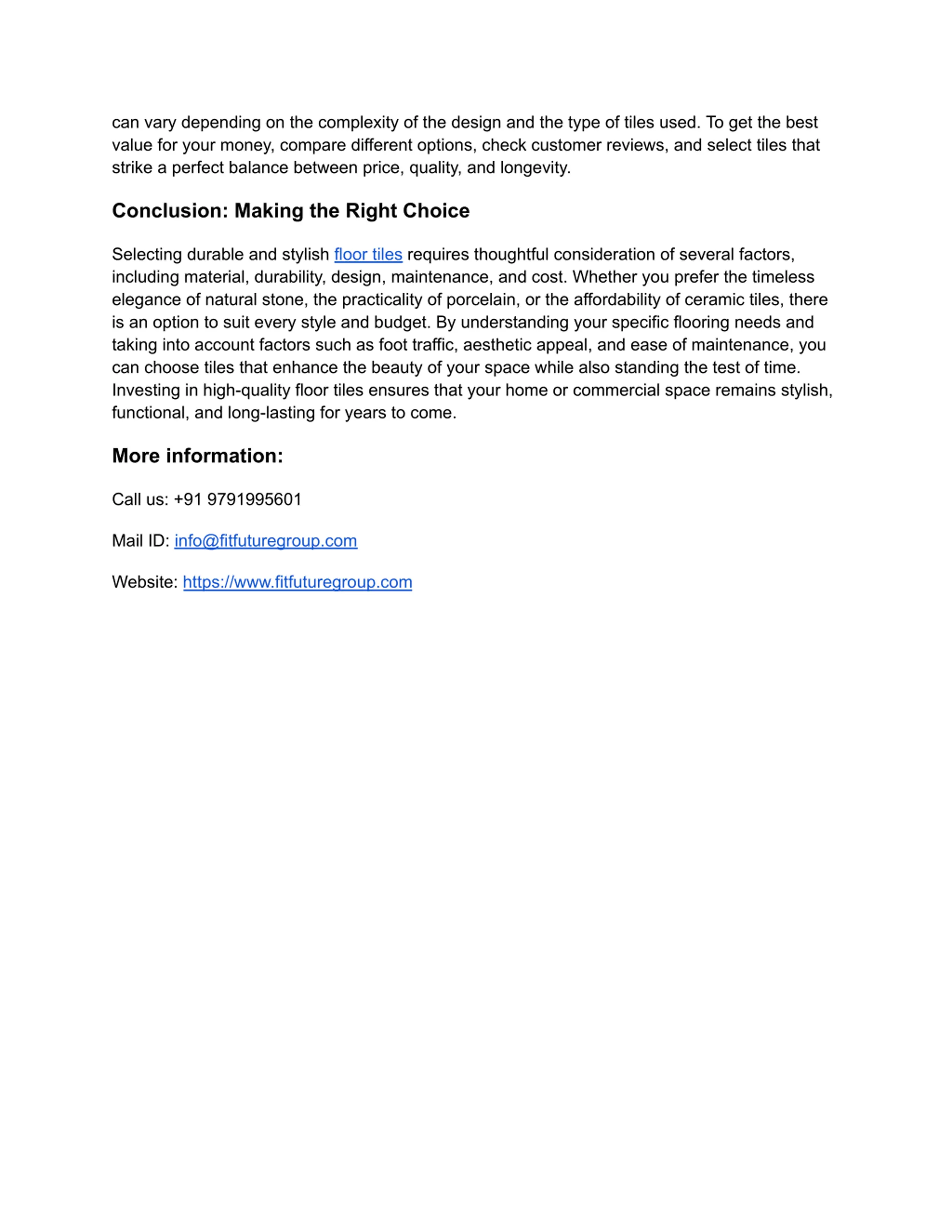 can vary depending on the complexity of the design and the type of tiles used. To get the best value for your money, compare different options, check customer reviews, and select tiles that strike a perfect balance between price, quality, and longevity. Conclusion: Making the Right Choice Selecting durable and stylish floor tiles requires thoughtful consideration of several factors, including material, durability, design, maintenance, and cost. Whether you prefer the timeless elegance of natural stone, the practicality of porcelain, or the affordability of ceramic tiles, there is an option to suit every style and budget. By understanding your specific flooring needs and taking into account factors such as foot traffic, aesthetic appeal, and ease of maintenance, you can choose tiles that enhance the beauty of your space while also standing the test of time. Investing in high-quality floor tiles ensures that your home or commercial space remains stylish, functional, and long-lasting for years to come. More information: Call us: +91 9791995601 Mail ID: info@fitfuturegroup.com Website: https://www.fitfuturegroup.com