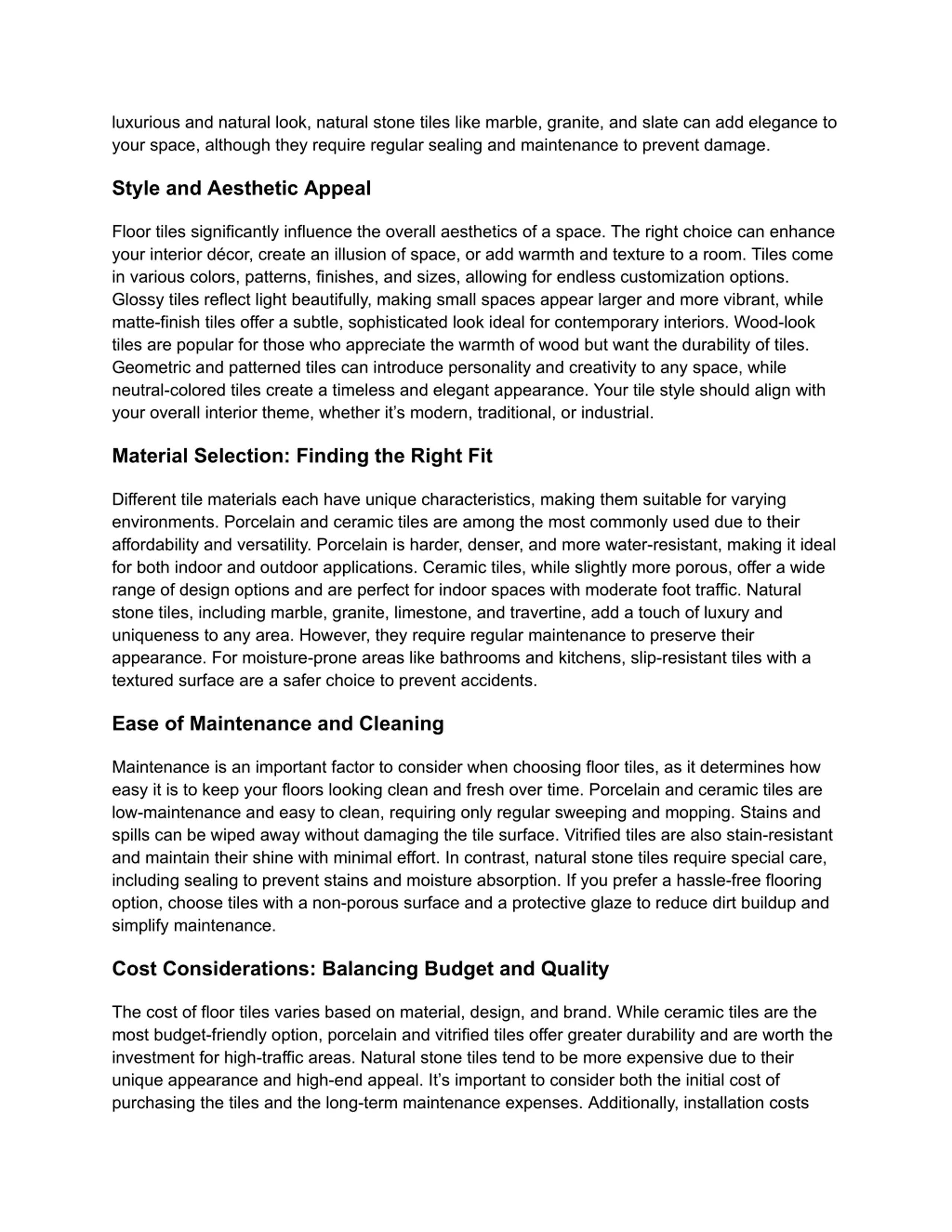 luxurious and natural look, natural stone tiles like marble, granite, and slate can add elegance to your space, although they require regular sealing and maintenance to prevent damage. Style and Aesthetic Appeal Floor tiles significantly influence the overall aesthetics of a space. The right choice can enhance your interior d cor, create an illusion of space, or add warmth and texture to a room. Tiles come in various colors, patterns, finishes, and sizes, allowing for endless customization options. Glossy tiles reflect light beautifully, making small spaces appear larger and more vibrant, while matte-finish tiles offer a subtle, sophisticated look ideal for contemporary interiors. Wood-look tiles are popular for those who appreciate the warmth of wood but want the durability of tiles. Geometric and patterned tiles can introduce personality and creativity to any space, while neutral-colored tiles create a timeless and elegant appearance. Your tile style should align with your overall interior theme, whether it s modern, traditional, or industrial. Material Selection: Finding the Right Fit Different tile materials each have unique characteristics, making them suitable for varying environments. Porcelain and ceramic tiles are among the most commonly used due to their affordability and versatility. Porcelain is harder, denser, and more water-resistant, making it ideal for both indoor and outdoor applications. Ceramic tiles, while slightly more porous, offer a wide range of design options and are perfect for indoor spaces with moderate foot traffic. Natural stone tiles, including marble, granite, limestone, and travertine, add a touch of luxury and uniqueness to any area. However, they require regular maintenance to preserve their appearance. For moisture-prone areas like bathrooms and kitchens, slip-resistant tiles with a textured surface are a safer choice to prevent accidents. Ease of Maintenance and Cleaning Maintenance is an important factor to consider when choosing floor tiles, as it determines how easy it is to keep your floors looking clean and fresh over time. Porcelain and ceramic tiles are low-maintenance and easy to clean, requiring only regular sweeping and mopping. Stains and spills can be wiped away without damaging the tile surface. Vitrified tiles are also stain-resistant and maintain their shine with minimal effort. In contrast, natural stone tiles require special care, including sealing to prevent stains and moisture absorption. If you prefer a hassle-free flooring option, choose tiles with a non-porous surface and a protective glaze to reduce dirt buildup and simplify maintenance. Cost Considerations: Balancing Budget and Quality The cost of floor tiles varies based on material, design, and brand. While ceramic tiles are the most budget-friendly option, porcelain and vitrified tiles offer greater durability and are worth the investment for high-traffic areas. Natural stone tiles tend to be more expensive due to their unique appearance and high-end appeal. It s important to consider both the initial cost of purchasing the tiles and the long-term maintenance expenses. Additionally, installation costs