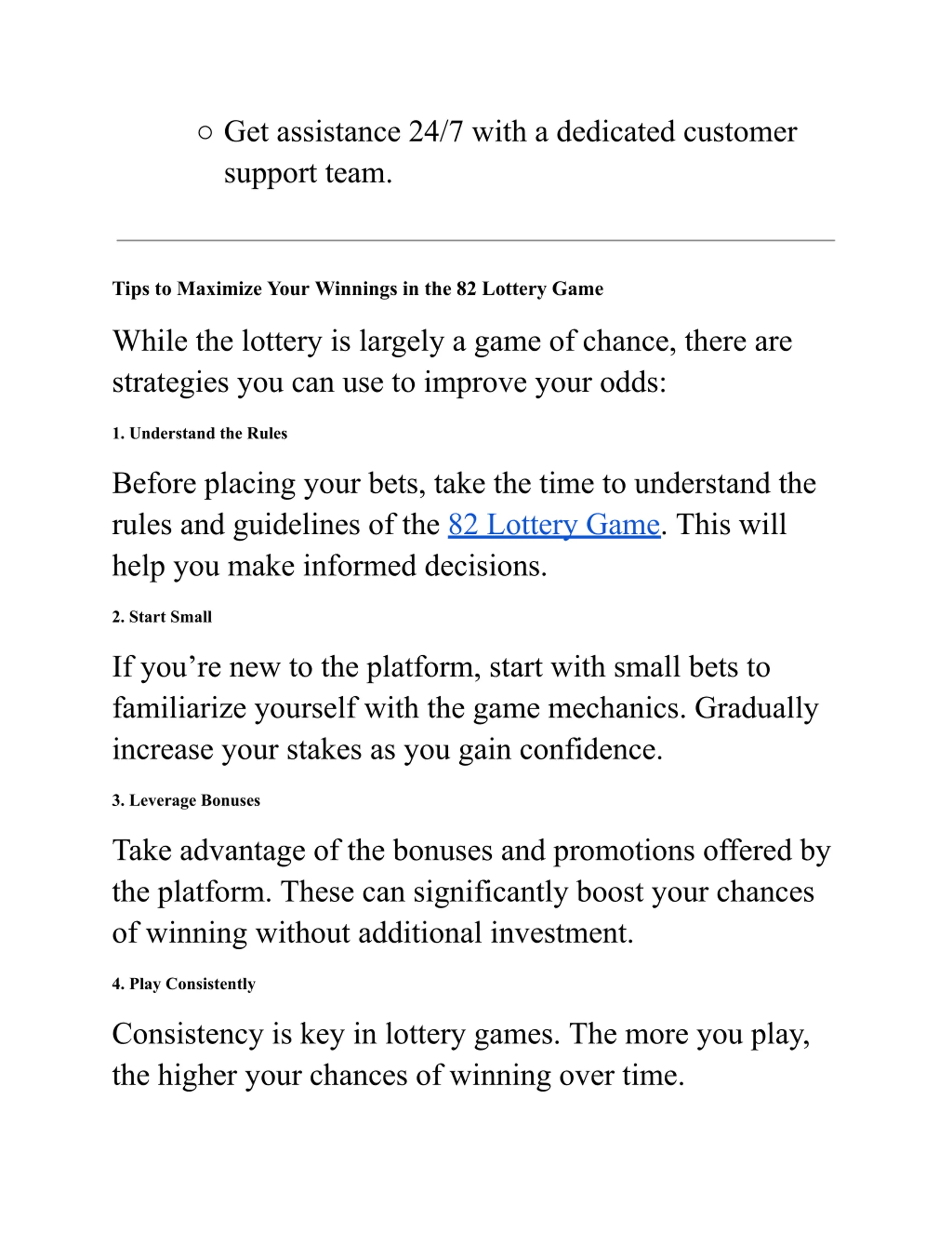 Get assistance 24/7 with a dedicated customer support team. Tips to Maximize Your Winnings in the 82 Lottery Game While the lottery is largely a game of chance, there are strategies you can use to improve your odds: 1. Understand the Rules Before placing your bets, take the time to understand the rules and guidelines of the 82 Lottery Game. This will help you make informed decisions. 2. Start Small If you re new to the platform, start with small bets to familiarize yourself with the game mechanics. Gradually increase your stakes as you gain confidence. 3. Leverage Bonuses Take advantage of the bonuses and promotions offered by the platform. These can significantly boost your chances of winning without additional investment. 4. Play Consistently Consistency is key in lottery games. The more you play, the higher your chances of winning over time.