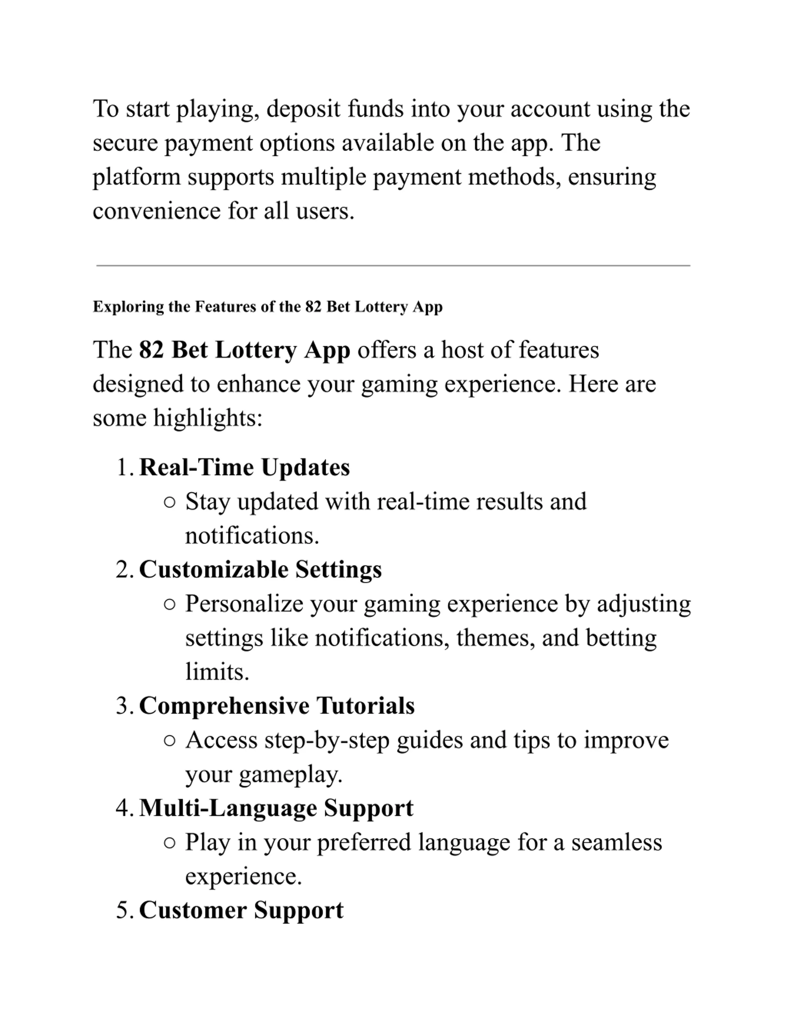 To start playing, deposit funds into your account using the secure payment options available on the app. The platform supports multiple payment methods, ensuring convenience for all users. Exploring the Features of the 82 Bet Lottery App The 82 Bet Lottery App offers a host of features designed to enhance your gaming experience. Here are some highlights: 1. Real-Time Updates Stay updated with real-time results and notifications. 2. Customizable Settings Personalize your gaming experience by adjusting settings like notifications, themes, and betting limits. 3. Comprehensive Tutorials Access step-by-step guides and tips to improve your gameplay. 4. Multi-Language Support Play in your preferred language for a seamless experience. 5. Customer Support