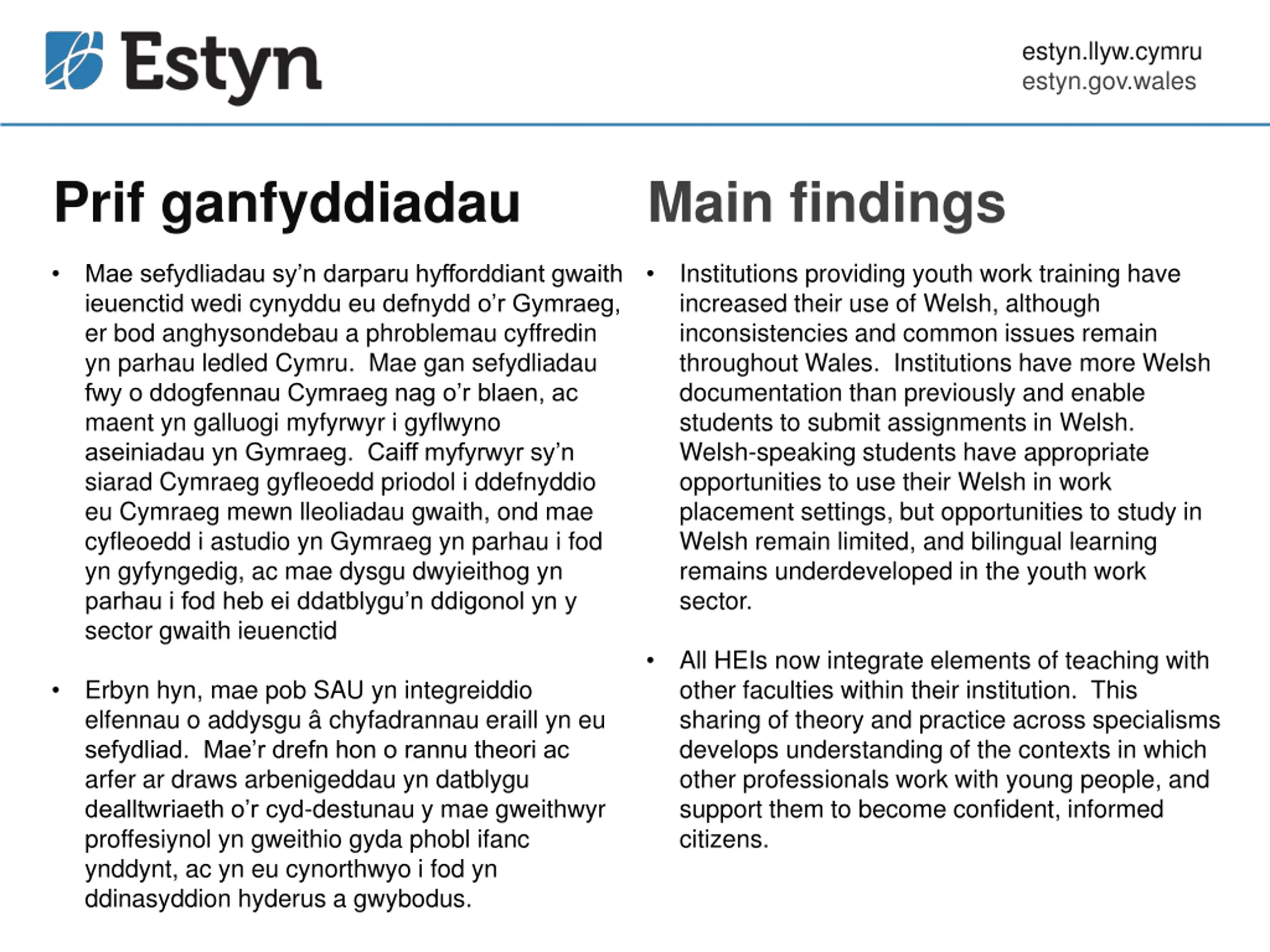estyn.llyw.cymru estyn.gov.wales Prif ganfyddiadau Main findings Institutions providing youth work training have increased their use of Welsh, although inconsistencies and common issues remain throughout Wales. Institutions have more Welsh documentation than previously and enable students to submit assignments in Welsh. Welsh-speaking students have appropriate opportunities to use their Welsh in work placement settings, but opportunities to study in Welsh remain limited, and bilingual learning remains underdeveloped in the youth work sector. Mae sefydliadau sy n darparu hyfforddiant gwaith ieuenctid wedi cynyddu eu defnydd o r Gymraeg, er bod anghysondebau a phroblemau cyffredin yn parhau ledled Cymru. Mae gan sefydliadau fwy o ddogfennau Cymraeg nag o r blaen, ac maent yn galluogi myfyrwyr i gyflwyno aseiniadau yn Gymraeg. Caiff myfyrwyr sy n siarad Cymraeg gyfleoedd priodol i ddefnyddio eu Cymraeg mewn lleoliadau gwaith, ond mae cyfleoedd i astudio yn Gymraeg yn parhau i fod yn gyfyngedig, ac mae dysgu dwyieithog yn parhau i fod heb ei ddatblygu n ddigonol yn y sector gwaith ieuenctid All HEIs now integrate elements of teaching with other faculties within their institution. This sharing of theory and practice across specialisms develops understanding of the contexts in which other professionals work with young people, and support them to become confident, informed citizens. Erbyn hyn, mae pob SAU yn integreiddio elfennau o addysgu chyfadrannau eraill yn eu sefydliad. Mae r drefn hon o rannu theori ac arfer ar draws arbenigeddau yn datblygu dealltwriaeth o r cyd-destunau y mae gweithwyr proffesiynol yn gweithio gyda phobl ifanc ynddynt, ac yn eu cynorthwyo i fod yn ddinasyddion hyderus a gwybodus.