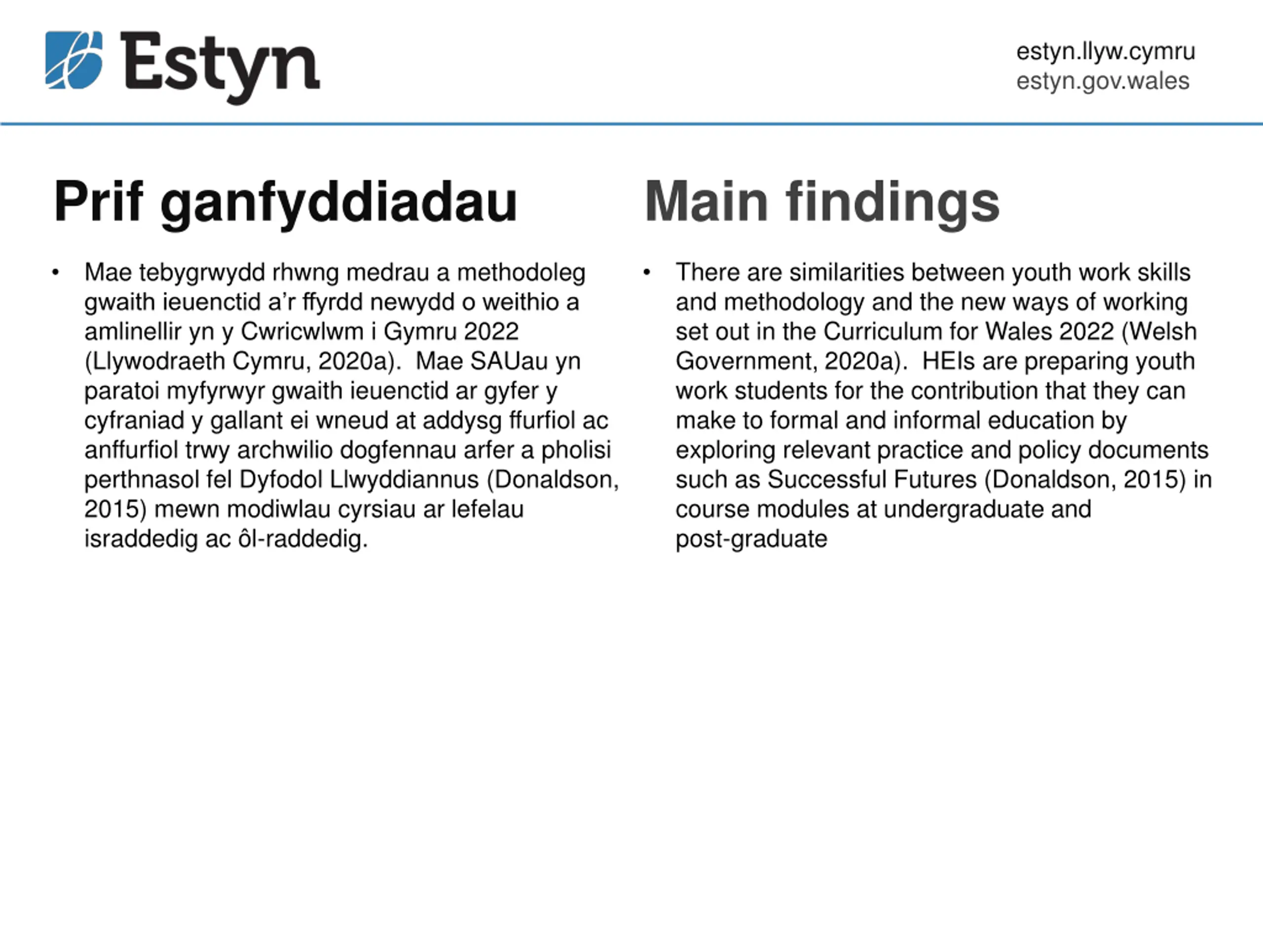 estyn.llyw.cymru estyn.gov.wales Prif ganfyddiadau Main findings Mae tebygrwydd rhwng medrau a methodoleg gwaith ieuenctid a r ffyrdd newydd o weithio a amlinellir yn y Cwricwlwm i Gymru 2022 (Llywodraeth Cymru, 2020a). Mae SAUau yn paratoi myfyrwyr gwaith ieuenctid ar gyfer y cyfraniad y gallant ei wneud at addysg ffurfiol ac anffurfiol trwy archwilio dogfennau arfer a pholisi perthnasol fel Dyfodol Llwyddiannus (Donaldson, 2015) mewn modiwlau cyrsiau ar lefelau israddedig ac l-raddedig. There are similarities between youth work skills and methodology and the new ways of working set out in the Curriculum for Wales 2022 (Welsh Government, 2020a). HEIs are preparing youth work students for the contribution that they can make to formal and informal education by exploring relevant practice and policy documents such as Successful Futures (Donaldson, 2015) in course modules at undergraduate and post-graduate
