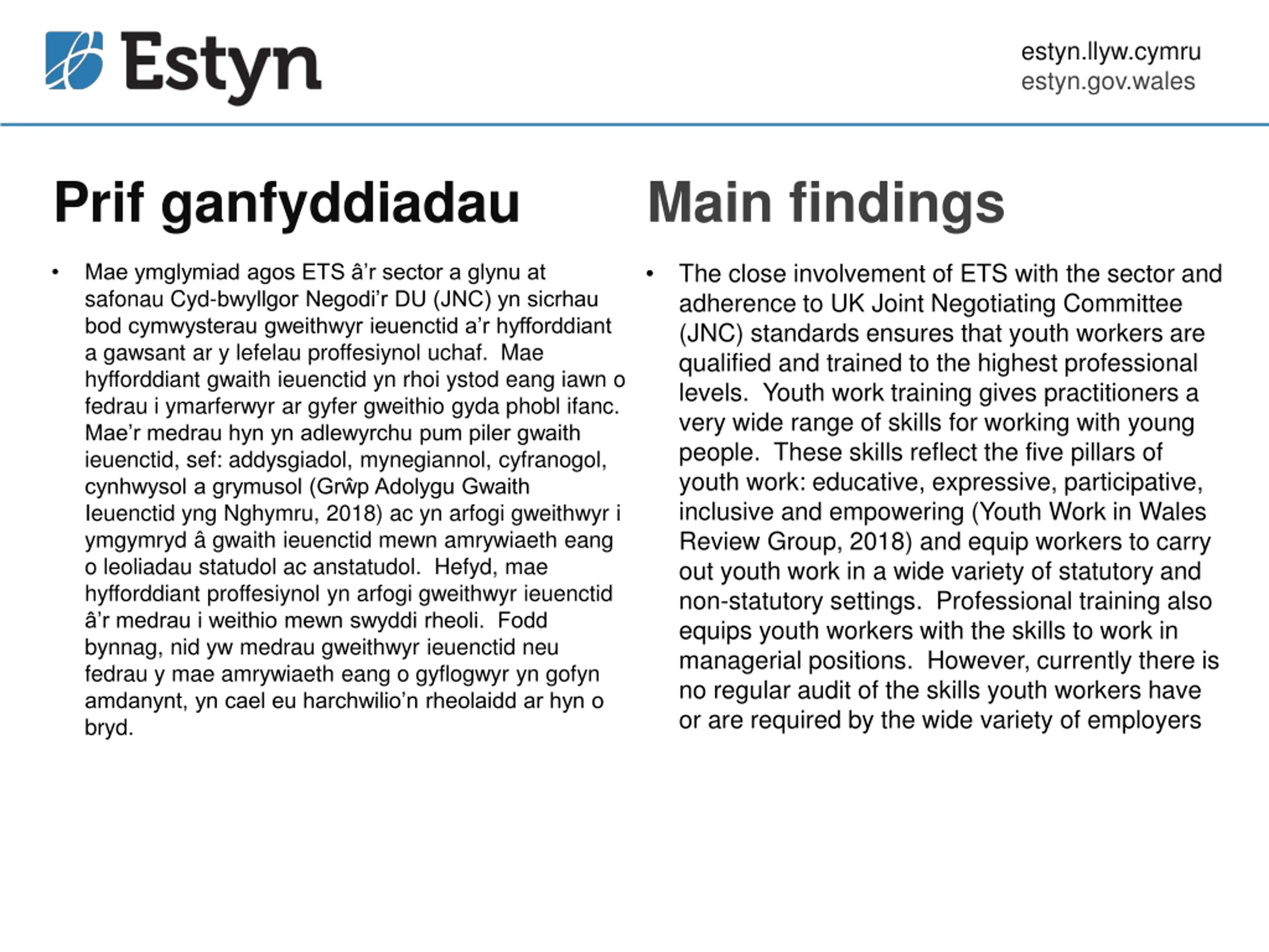estyn.llyw.cymru estyn.gov.wales Prif ganfyddiadau Main findings The close involvement of ETS with the sector and adherence to UK Joint Negotiating Committee (JNC) standards ensures that youth workers are qualified and trained to the highest professional levels. Youth work training gives practitioners a very wide range of skills for working with young people. These skills reflect the five pillars of youth work: educative, expressive, participative, inclusive and empowering (Youth Work in Wales Review Group, 2018) and equip workers to carry out youth work in a wide variety of statutory and non-statutory settings. Professional training also equips youth workers with the skills to work in managerial positions. However, currently there is no regular audit of the skills youth workers have or are required by the wide variety of employers Mae ymglymiad agos ETS r sector a glynu at safonau Cyd-bwyllgor Negodi r DU (JNC) yn sicrhau bod cymwysterau gweithwyr ieuenctid a r hyfforddiant a gawsant ar y lefelau proffesiynol uchaf. Mae hyfforddiant gwaith ieuenctid yn rhoi ystod eang iawn o fedrau i ymarferwyr ar gyfer gweithio gyda phobl ifanc. Mae r medrau hyn yn adlewyrchu pum piler gwaith ieuenctid, sef: addysgiadol, mynegiannol, cyfranogol, cynhwysol a grymusol (Gr p Adolygu Gwaith Ieuenctid yng Nghymru, 2018) ac yn arfogi gweithwyr i ymgymryd gwaith ieuenctid mewn amrywiaeth eang o leoliadau statudol ac anstatudol. Hefyd, mae hyfforddiant proffesiynol yn arfogi gweithwyr ieuenctid r medrau i weithio mewn swyddi rheoli. Fodd bynnag, nid yw medrau gweithwyr ieuenctid neu fedrau y mae amrywiaeth eang o gyflogwyr yn gofyn amdanynt, yn cael eu harchwilio n rheolaidd ar hyn o bryd.