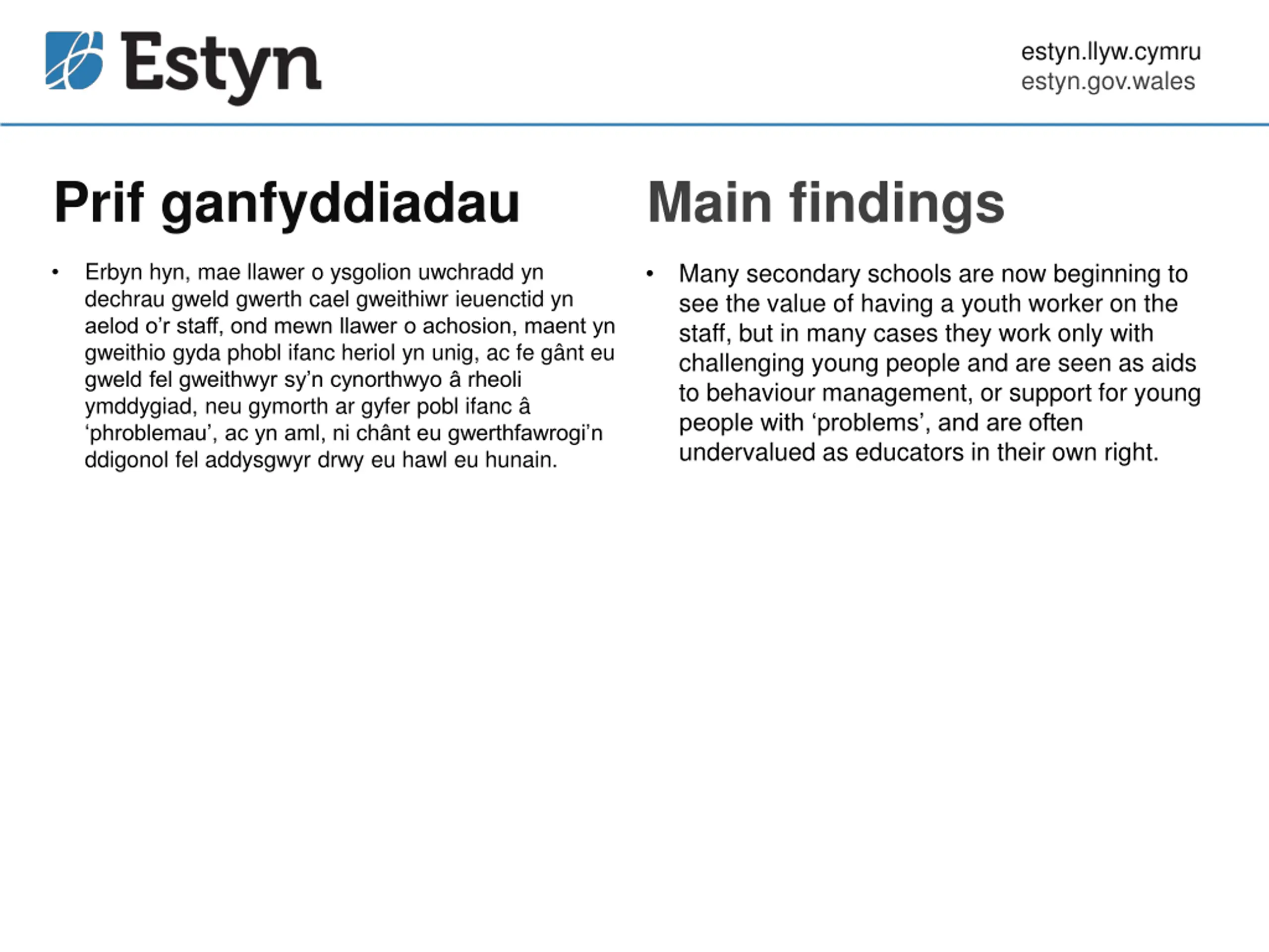 estyn.llyw.cymru estyn.gov.wales Prif ganfyddiadau Main findings Many secondary schools are now beginning to see the value of having a youth worker on the staff, but in many cases they work only with challenging young people and are seen as aids to behaviour management, or support for young people with problems , and are often undervalued as educators in their own right. Erbyn hyn, mae llawer o ysgolion uwchradd yn dechrau gweld gwerth cael gweithiwr ieuenctid yn aelod o r staff, ond mewn llawer o achosion, maent yn gweithio gyda phobl ifanc heriol yn unig, ac fe g nt eu gweld fel gweithwyr sy n cynorthwyo rheoli ymddygiad, neu gymorth ar gyfer pobl ifanc phroblemau , ac yn aml, ni ch nt eu gwerthfawrogi n ddigonol fel addysgwyr drwy eu hawl eu hunain.