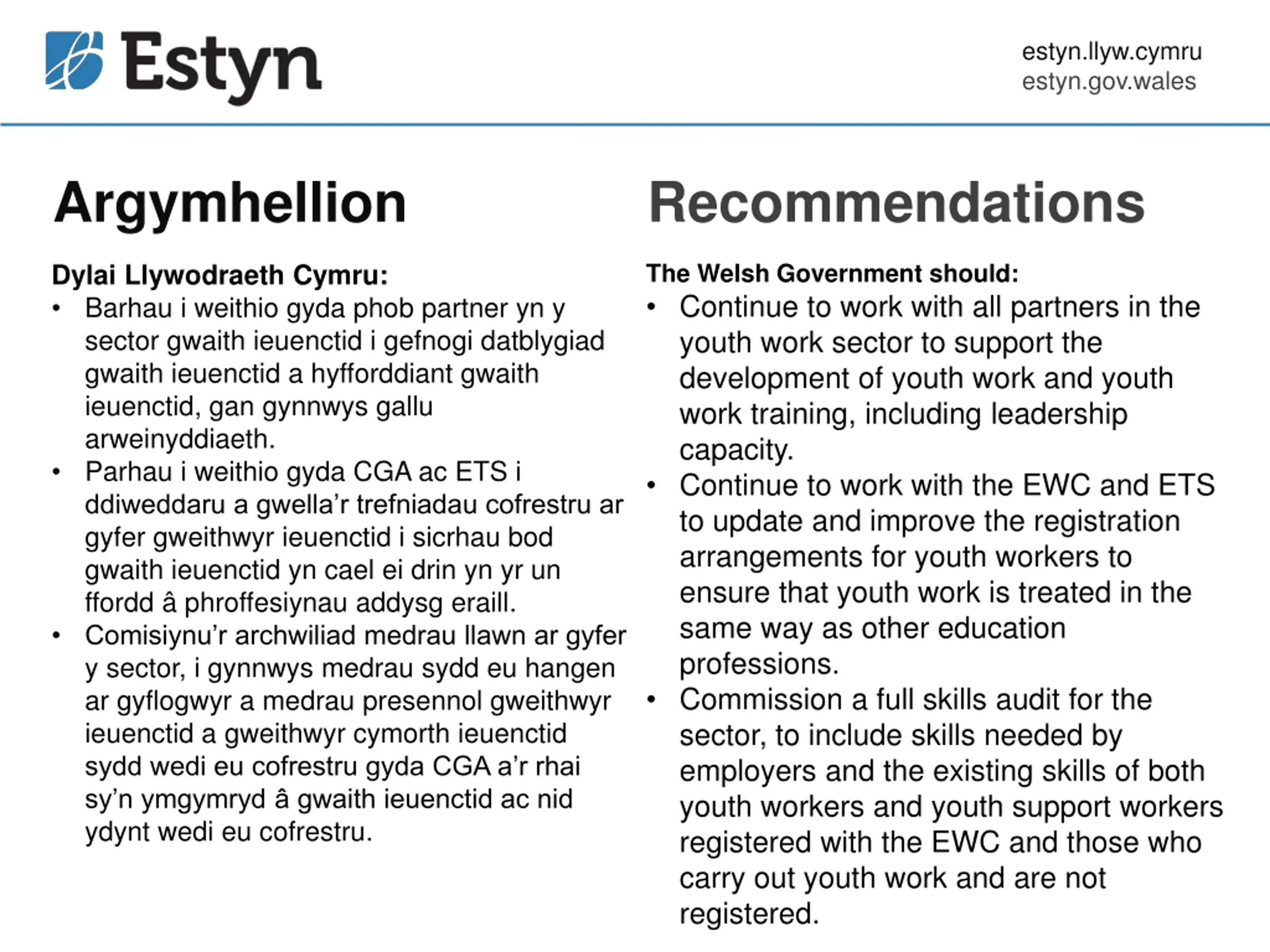 estyn.llyw.cymru estyn.gov.wales Argymhellion Recommendations The Welsh Government should: Continue to work with all partners in the youth work sector to support the development of youth work and youth work training, including leadership capacity. Continue to work with the EWC and ETS to update and improve the registration arrangements for youth workers to ensure that youth work is treated in the same way as other education professions. Commission a full skills audit for the sector, to include skills needed by employers and the existing skills of both youth workers and youth support workers registered with the EWC and those who carry out youth work and are not registered. Dylai Llywodraeth Cymru: Barhau i weithio gyda phob partner yn y sector gwaith ieuenctid i gefnogi datblygiad gwaith ieuenctid a hyfforddiant gwaith ieuenctid, gan gynnwys gallu arweinyddiaeth. Parhau i weithio gyda CGA ac ETS i ddiweddaru a gwella r trefniadau cofrestru ar gyfer gweithwyr ieuenctid i sicrhau bod gwaith ieuenctid yn cael ei drin yn yr un ffordd phroffesiynau addysg eraill. Comisiynu r archwiliad medrau llawn ar gyfer y sector, i gynnwys medrau sydd eu hangen ar gyflogwyr a medrau presennol gweithwyr ieuenctid a gweithwyr cymorth ieuenctid sydd wedi eu cofrestru gyda CGA a r rhai sy n ymgymryd gwaith ieuenctid ac nid ydynt wedi eu cofrestru.