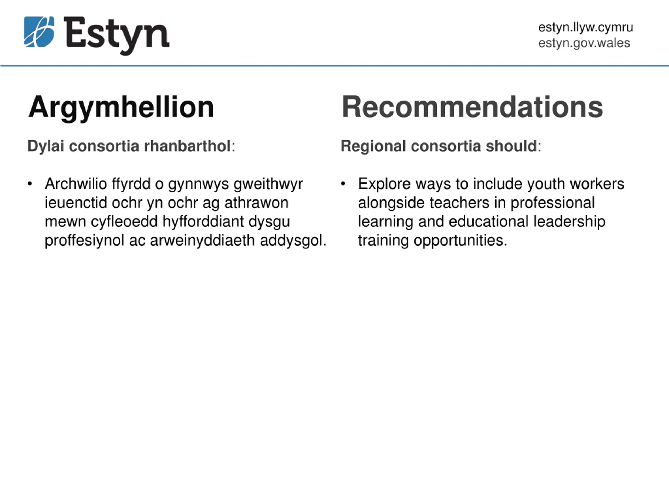 estyn.llyw.cymru estyn.gov.wales Argymhellion Recommendations Dylai consortia rhanbarthol: Regional consortia should: Archwilio ffyrdd o gynnwys gweithwyr ieuenctid ochr yn ochr ag athrawon mewn cyfleoedd hyfforddiant dysgu proffesiynol ac arweinyddiaeth addysgol. Explore ways to include youth workers alongside teachers in professional learning and educational leadership training opportunities.