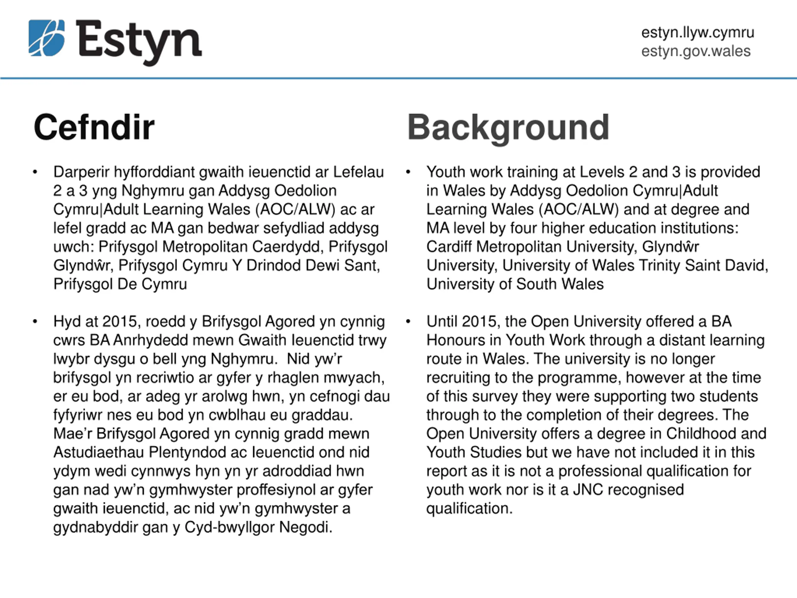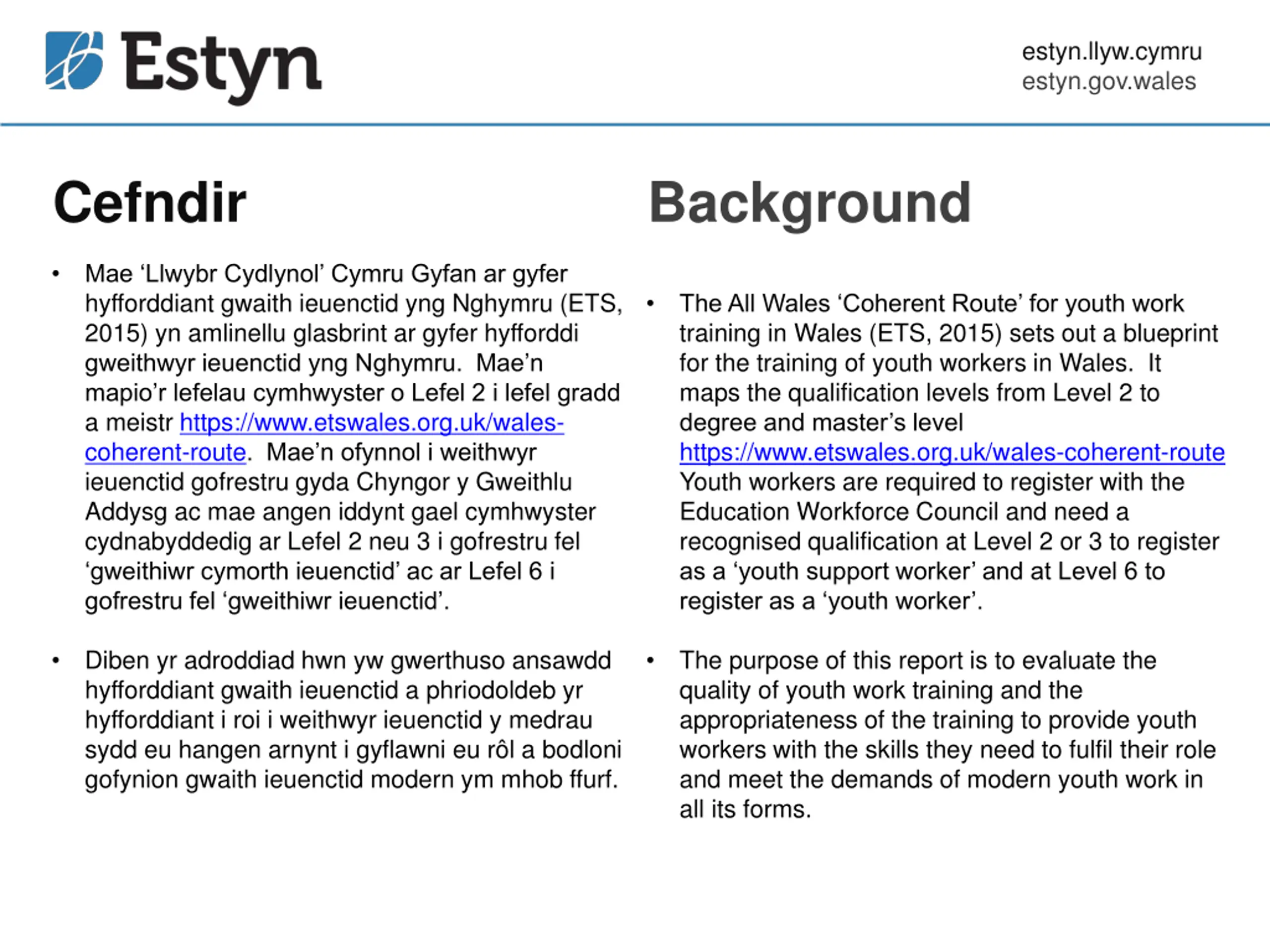 estyn.llyw.cymru estyn.gov.wales Cefndir Background Mae Llwybr Cydlynol Cymru Gyfan ar gyfer hyfforddiant gwaith ieuenctid yng Nghymru (ETS, 2015) yn amlinellu glasbrint ar gyfer hyfforddi gweithwyr ieuenctid yng Nghymru. Mae n mapio r lefelau cymhwyster o Lefel 2 i lefel gradd a meistr https://www.etswales.org.uk/wales- coherent-route. Mae n ofynnol i weithwyr ieuenctid gofrestru gyda Chyngor y Gweithlu Addysg ac mae angen iddynt gael cymhwyster cydnabyddedig ar Lefel 2 neu 3 i gofrestru fel gweithiwr cymorth ieuenctid ac ar Lefel 6 i gofrestru fel gweithiwr ieuenctid . The All Wales Coherent Route for youth work training in Wales (ETS, 2015) sets out a blueprint for the training of youth workers in Wales. It maps the qualification levels from Level 2 to degree and master s level https://www.etswales.org.uk/wales-coherent-route Youth workers are required to register with the Education Workforce Council and need a recognised qualification at Level 2 or 3 to register as a youth support worker and at Level 6 to register as a youth worker . Diben yr adroddiad hwn yw gwerthuso ansawdd hyfforddiant gwaith ieuenctid a phriodoldeb yr hyfforddiant i roi i weithwyr ieuenctid y medrau sydd eu hangen arnynt i gyflawni eu r l a bodloni gofynion gwaith ieuenctid modern ym mhob ffurf. The purpose of this report is to evaluate the quality of youth work training and the appropriateness of the training to provide youth workers with the skills they need to fulfil their role and meet the demands of modern youth work in all its forms.