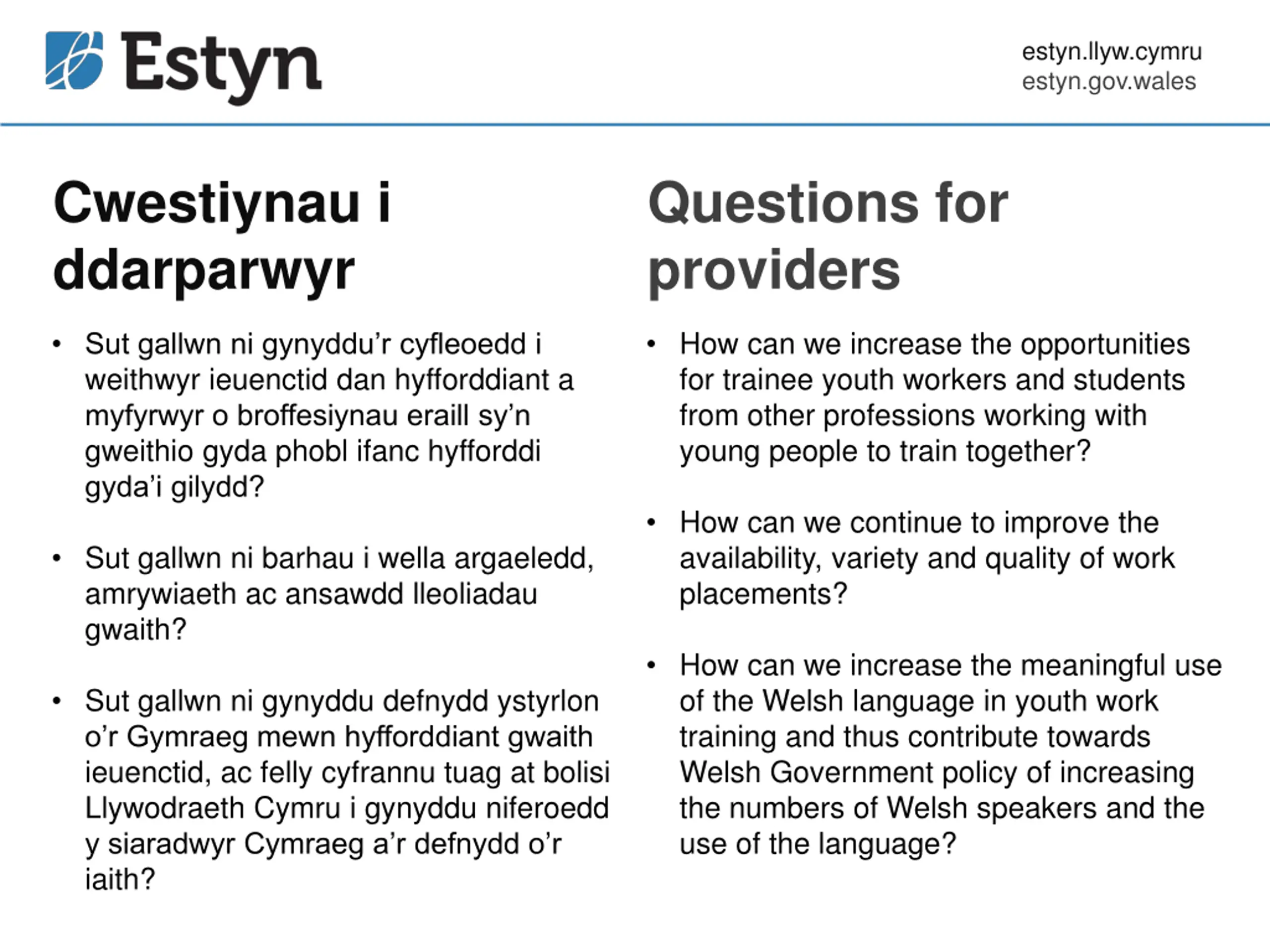 estyn.llyw.cymru estyn.gov.wales Cwestiynau i ddarparwyr Questions for providers How can we increase the opportunities for trainee youth workers and students from other professions working with young people to train together? Sut gallwn ni gynyddu r cyfleoedd i weithwyr ieuenctid dan hyfforddiant a myfyrwyr o broffesiynau eraill sy n gweithio gyda phobl ifanc hyfforddi gyda i gilydd? How can we continue to improve the availability, variety and quality of work placements? Sut gallwn ni barhau i wella argaeledd, amrywiaeth ac ansawdd lleoliadau gwaith? How can we increase the meaningful use of the Welsh language in youth work training and thus contribute towards Welsh Government policy of increasing the numbers of Welsh speakers and the use of the language? Sut gallwn ni gynyddu defnydd ystyrlon o r Gymraeg mewn hyfforddiant gwaith ieuenctid, ac felly cyfrannu tuag at bolisi Llywodraeth Cymru i gynyddu niferoedd y siaradwyr Cymraeg a r defnydd o r iaith?