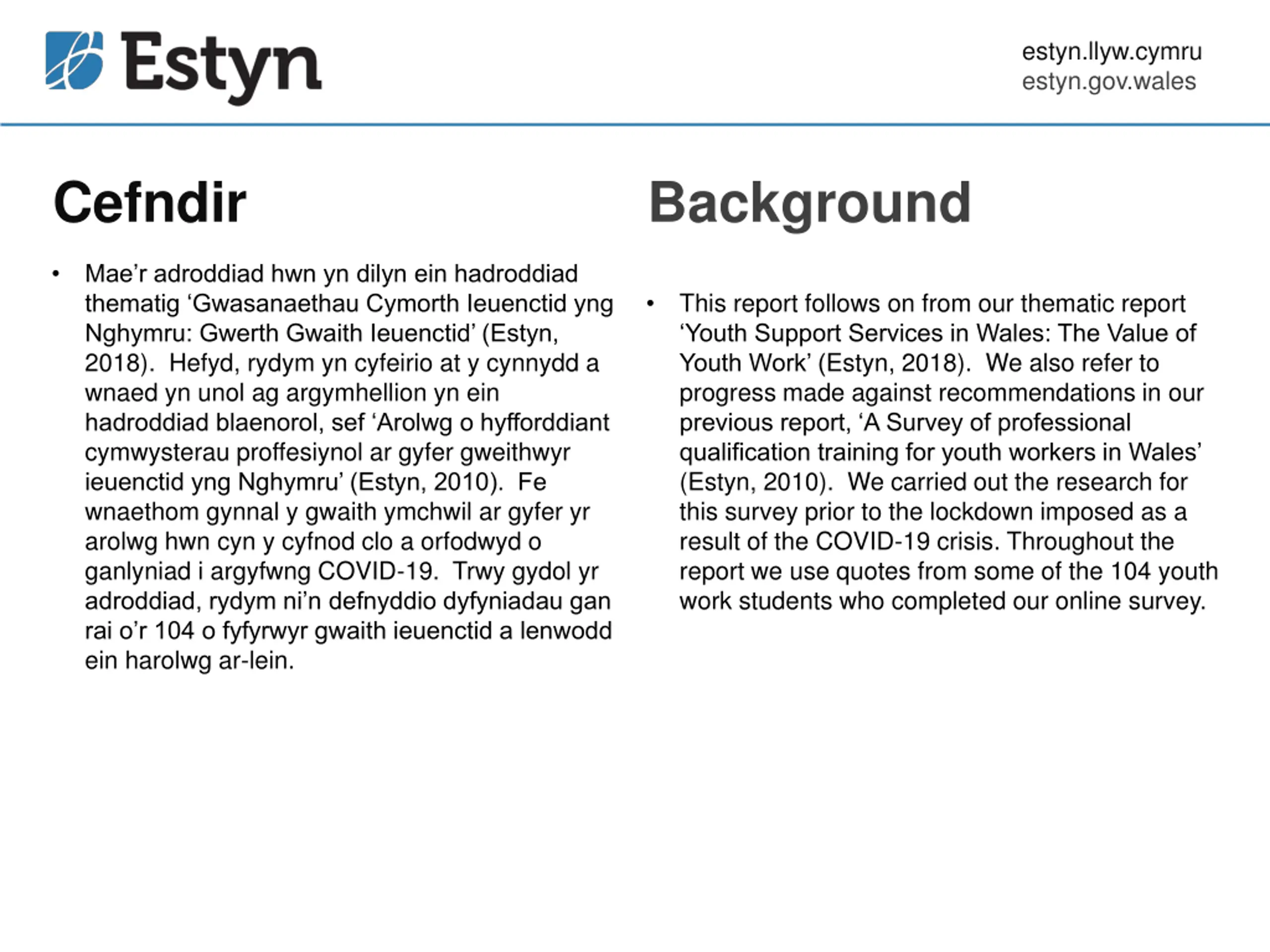 estyn.llyw.cymru estyn.gov.wales Cefndir Background Mae r adroddiad hwn yn dilyn ein hadroddiad thematig Gwasanaethau Cymorth Ieuenctid yng Nghymru: Gwerth Gwaith Ieuenctid (Estyn, 2018). Hefyd, rydym yn cyfeirio at y cynnydd a wnaed yn unol ag argymhellion yn ein hadroddiad blaenorol, sef Arolwg o hyfforddiant cymwysterau proffesiynol ar gyfer gweithwyr ieuenctid yng Nghymru (Estyn, 2010). Fe wnaethom gynnal y gwaith ymchwil ar gyfer yr arolwg hwn cyn y cyfnod clo a orfodwyd o ganlyniad i argyfwng COVID-19. Trwy gydol yr adroddiad, rydym ni n defnyddio dyfyniadau gan rai o r 104 o fyfyrwyr gwaith ieuenctid a lenwodd ein harolwg ar-lein. This report follows on from our thematic report Youth Support Services in Wales: The Value of Youth Work (Estyn, 2018). We also refer to progress made against recommendations in our previous report, A Survey of professional qualification training for youth workers in Wales (Estyn, 2010). We carried out the research for this survey prior to the lockdown imposed as a result of the COVID-19 crisis. Throughout the report we use quotes from some of the 104 youth work students who completed our online survey.