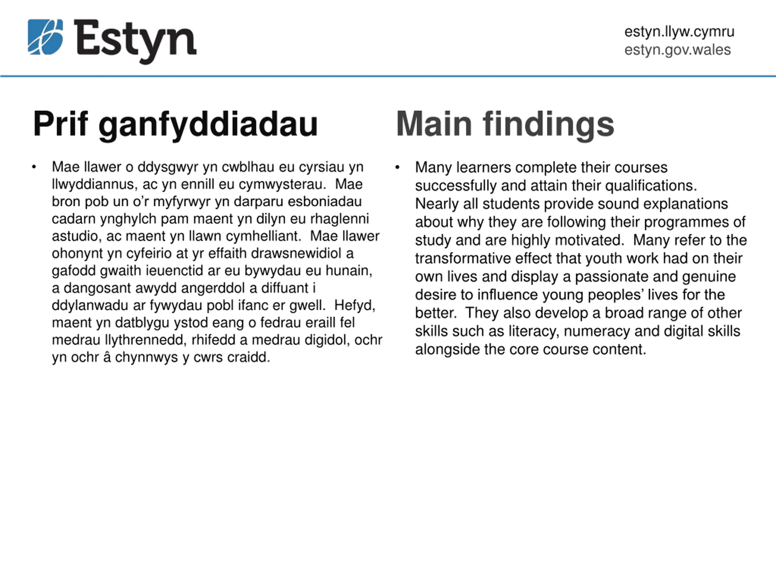 estyn.llyw.cymru estyn.gov.wales Prif ganfyddiadau Main findings Many learners complete their courses successfully and attain their qualifications. Nearly all students provide sound explanations about why they are following their programmes of study and are highly motivated. Many refer to the transformative effect that youth work had on their own lives and display a passionate and genuine desire to influence young peoples lives for the better. They also develop a broad range of other skills such as literacy, numeracy and digital skills alongside the core course content. Mae llawer o ddysgwyr yn cwblhau eu cyrsiau yn llwyddiannus, ac yn ennill eu cymwysterau. Mae bron pob un o r myfyrwyr yn darparu esboniadau cadarn ynghylch pam maent yn dilyn eu rhaglenni astudio, ac maent yn llawn cymhelliant. Mae llawer ohonynt yn cyfeirio at yr effaith drawsnewidiol a gafodd gwaith ieuenctid ar eu bywydau eu hunain, a dangosant awydd angerddol a diffuant i ddylanwadu ar fywydau pobl ifanc er gwell. Hefyd, maent yn datblygu ystod eang o fedrau eraill fel medrau llythrennedd, rhifedd a medrau digidol, ochr yn ochr chynnwys y cwrs craidd.