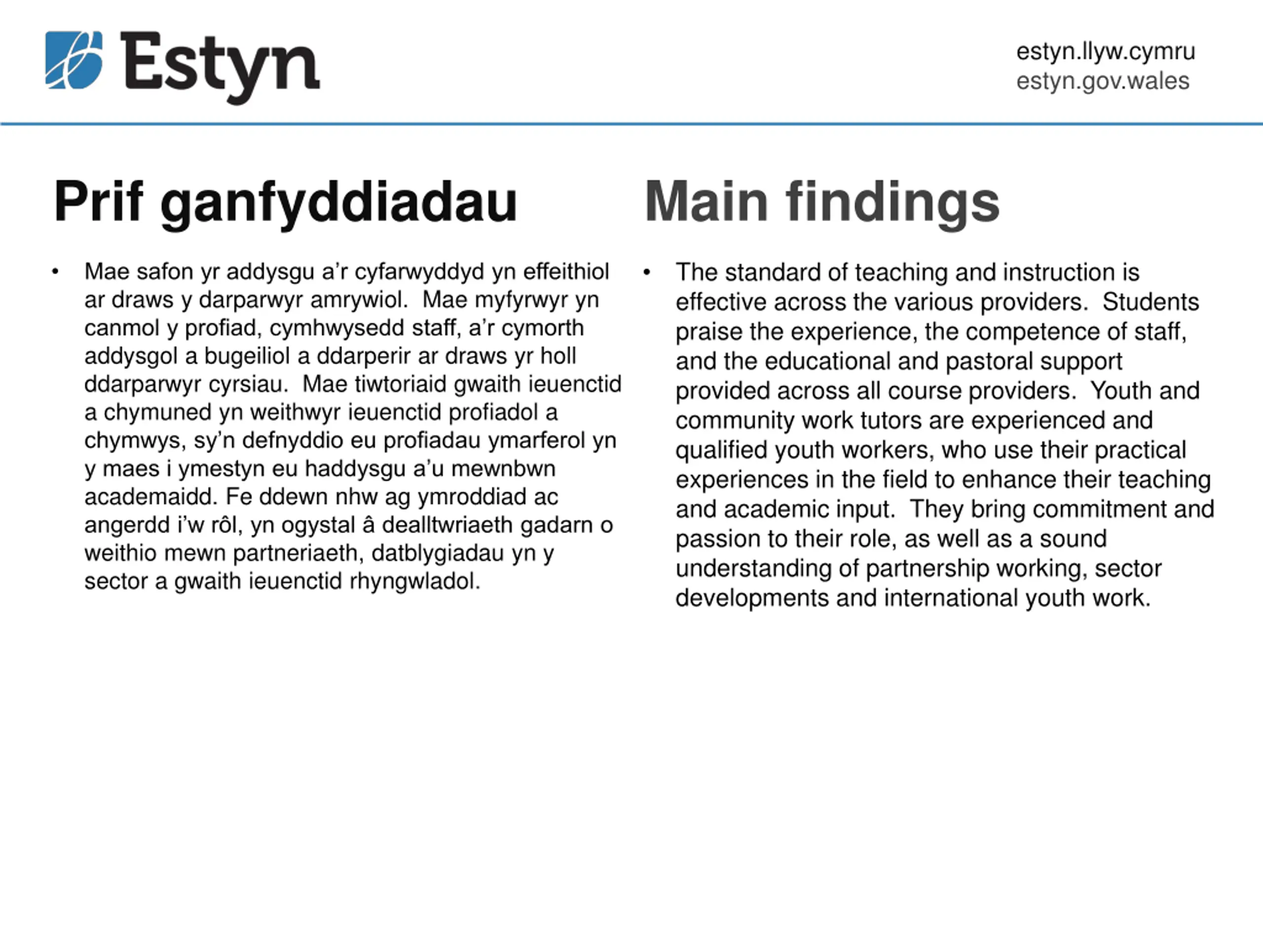 estyn.llyw.cymru estyn.gov.wales Prif ganfyddiadau Main findings The standard of teaching and instruction is effective across the various providers. Students praise the experience, the competence of staff, and the educational and pastoral support provided across all course providers. Youth and community work tutors are experienced and qualified youth workers, who use their practical experiences in the field to enhance their teaching and academic input. They bring commitment and passion to their role, as well as a sound understanding of partnership working, sector developments and international youth work. Mae safon yr addysgu a r cyfarwyddyd yn effeithiol ar draws y darparwyr amrywiol. Mae myfyrwyr yn canmol y profiad, cymhwysedd staff, a r cymorth addysgol a bugeiliol a ddarperir ar draws yr holl ddarparwyr cyrsiau. Mae tiwtoriaid gwaith ieuenctid a chymuned yn weithwyr ieuenctid profiadol a chymwys, sy n defnyddio eu profiadau ymarferol yn y maes i ymestyn eu haddysgu a u mewnbwn academaidd. Fe ddewn nhw ag ymroddiad ac angerdd i w r l, yn ogystal dealltwriaeth gadarn o weithio mewn partneriaeth, datblygiadau yn y sector a gwaith ieuenctid rhyngwladol.
